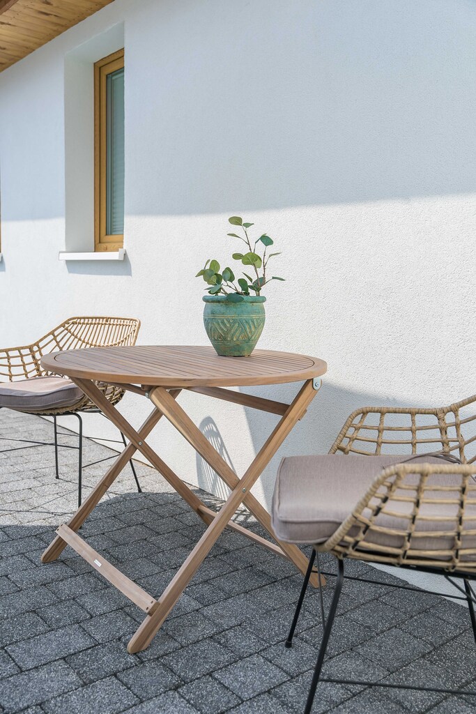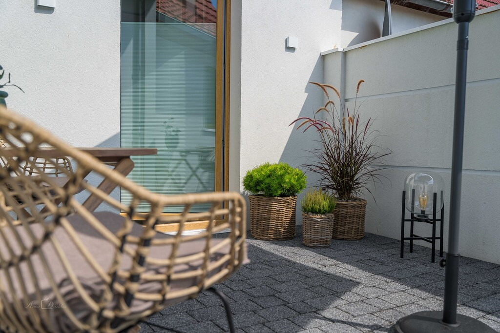 Taras stanowi idealną przestrzeń do wypoczynku – miejsce na poranną kawę lub relaks po pracy.