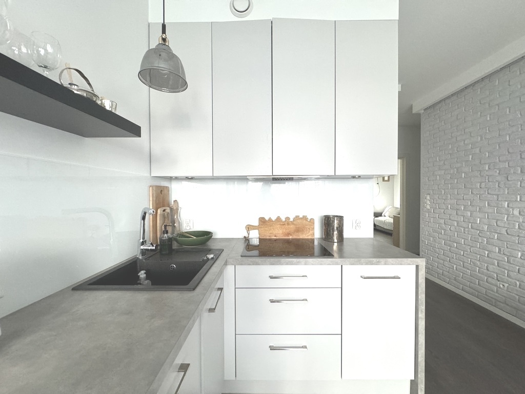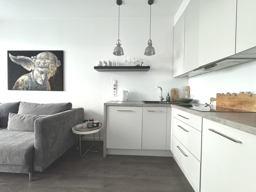 Kuchnia w pełni wyposażona w gustowne meble w zabudowie oraz sprzęt AGD: lodówkę, zmywarkę.