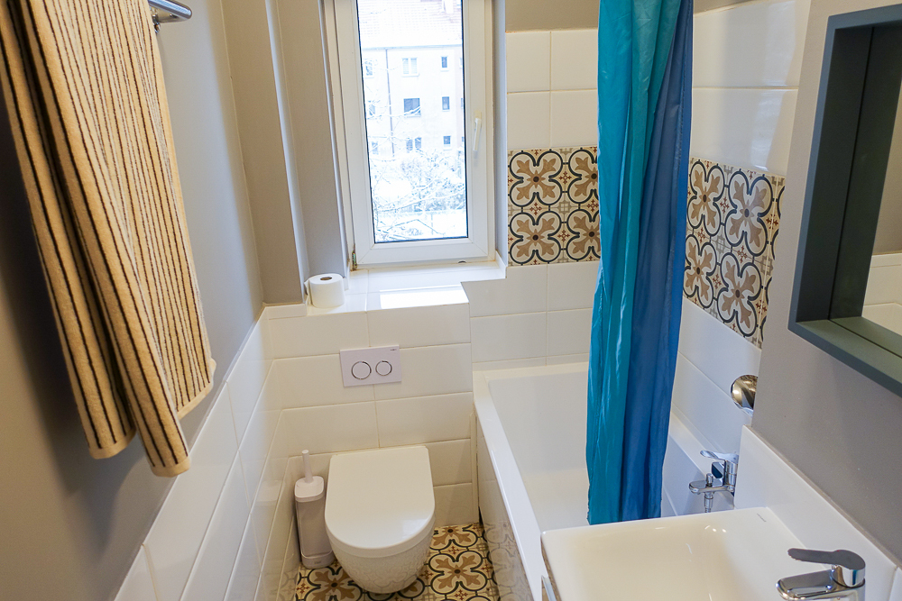 Łazienka z wanną, umywalką, i WC oraz z oknem w glazurze i terakocie.