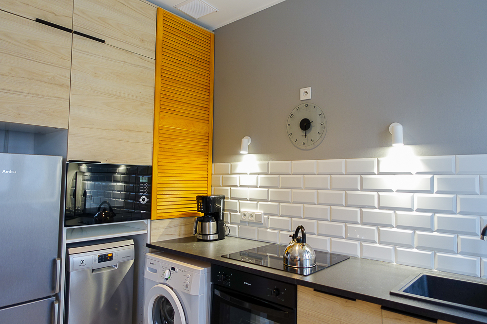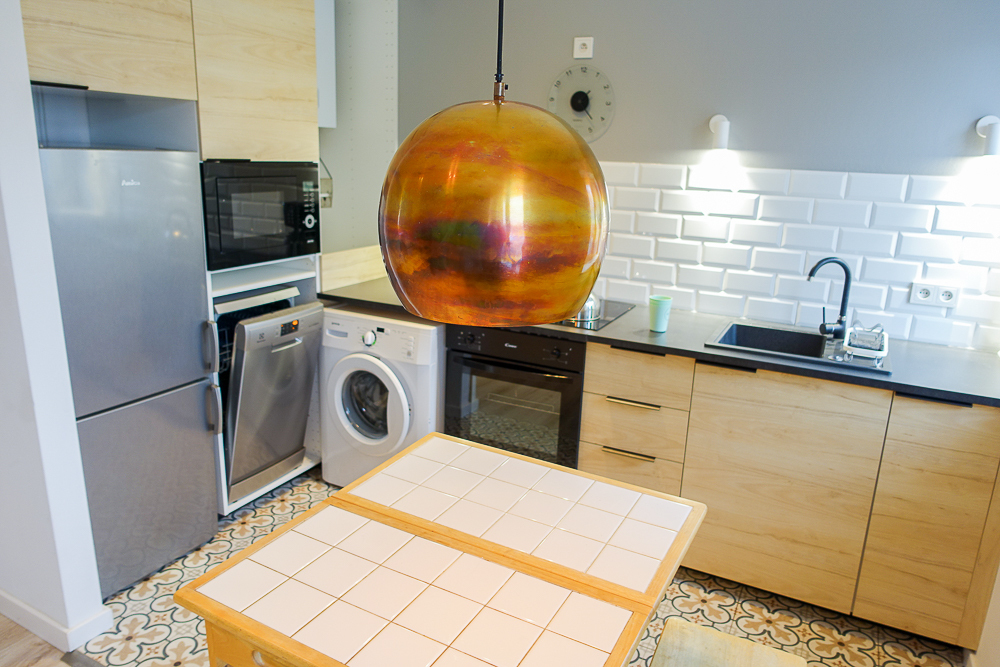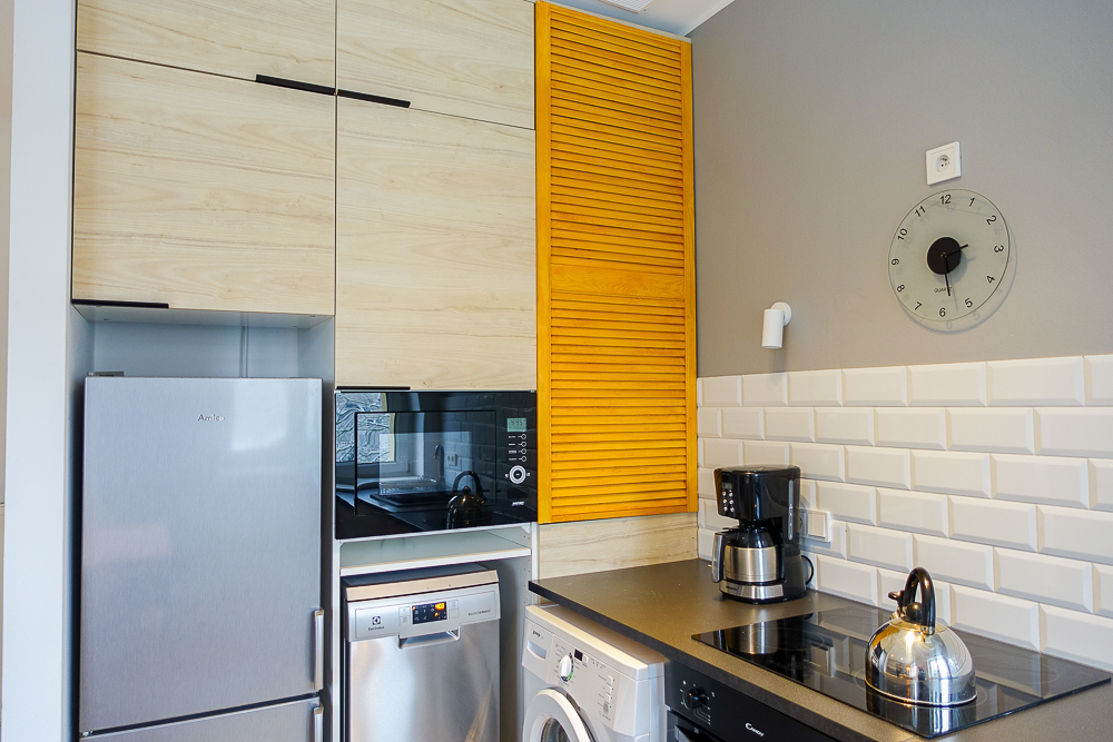 Pokój dzienny z aneksem kuchennym w nowoczesnej zabudowie meblowej wraz z urządzeniami AGD: zmywarka ELEKTROLUX 45 cm, piekarnik elektryczny CANDY, płyta ceramiczna BOSCH, lodówka z zamrażarką AMICA, pralka. Na podłodze w aneksie kuchennym terakota, na ścianie pas glazury.