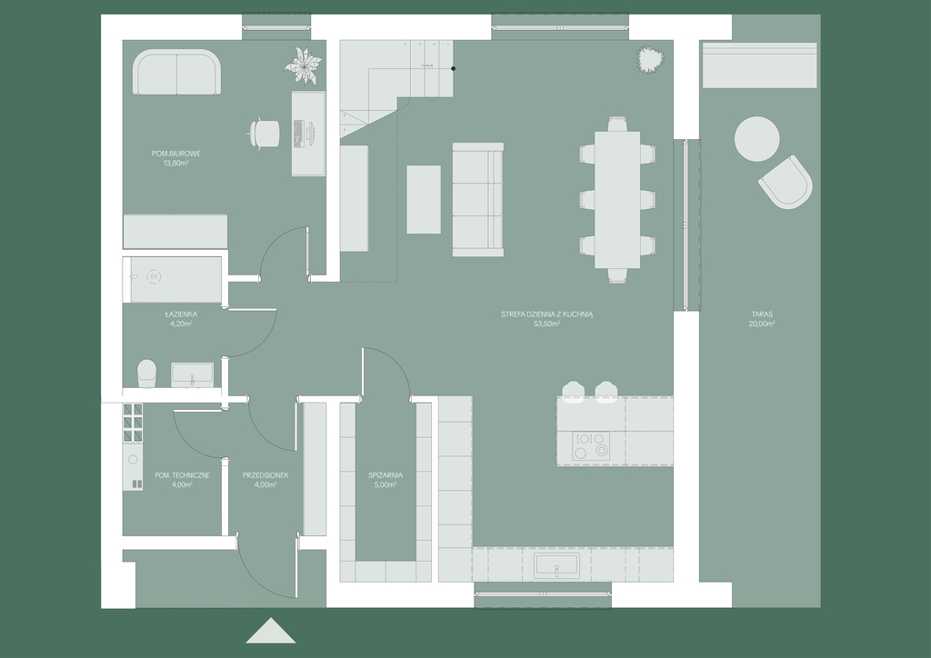 • Strefa dzienna z kuchnią: 53,50 m2 (duże przeszklenia, wyjście na taras)