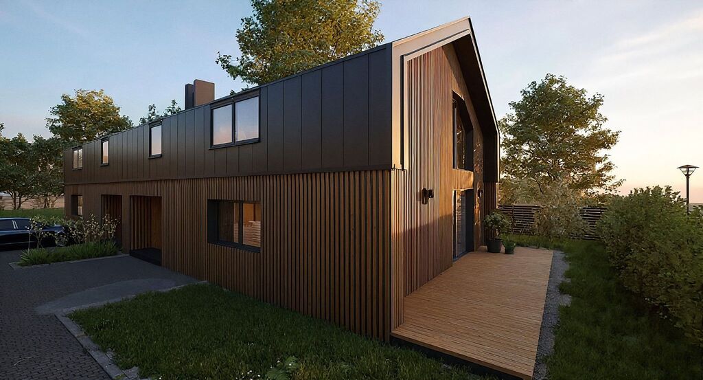 • Elewacja: Panele WPC o strukturze drewna na parterze oraz blacha na rąbek stojący marki RUKKI w kolorze antracytowym.
