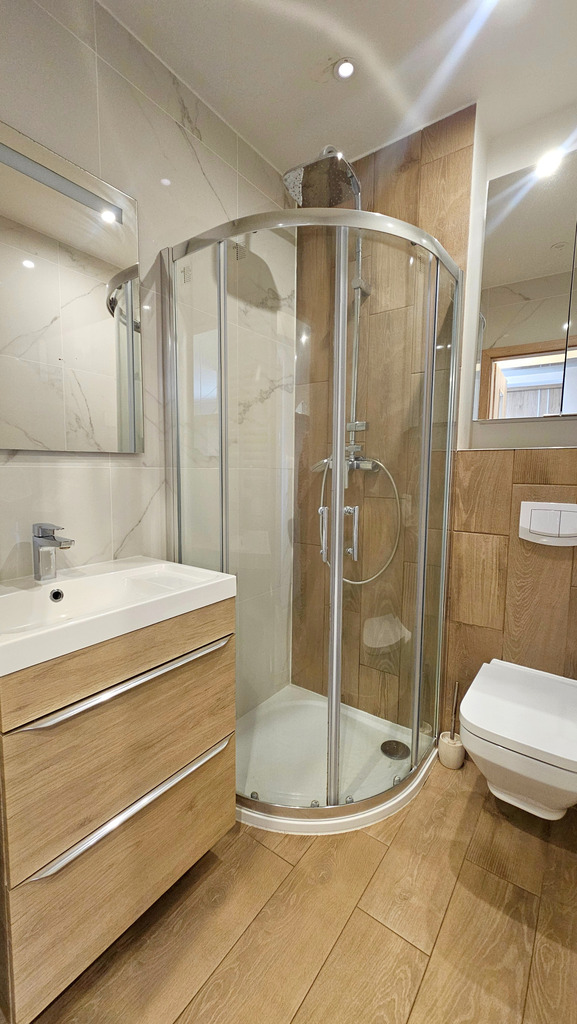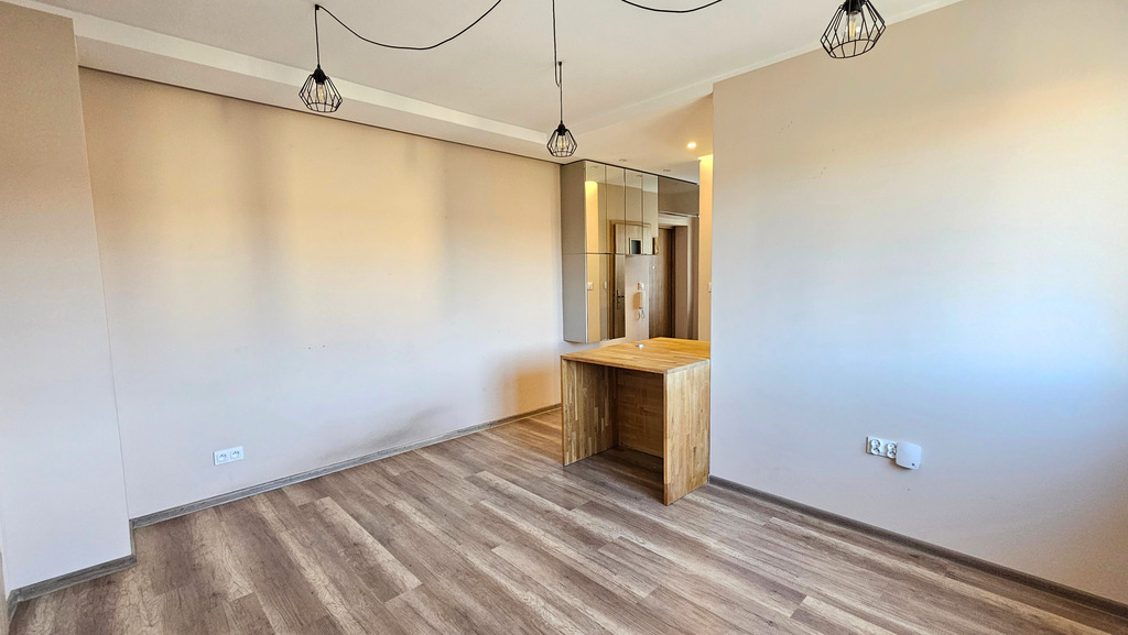Salon jest miejscem, w którym można naprawdę odpocząć. Sprawdzi się zarówno na spokojne wieczory, jak i spotkania z bliskimi. Obok znajduje się sypialnia z dużą szafą w zabudowie, która porządkuje przestrzeń i pozwala zachować wnętrze w harmonii. Kuchnia jest w pełni umeblowana i wyposażona w sprzęt AGD – gotowa do użytku od pierwszego dnia. Całość uzupełnia łazienka z prysznicem oraz praktyczny korytarz