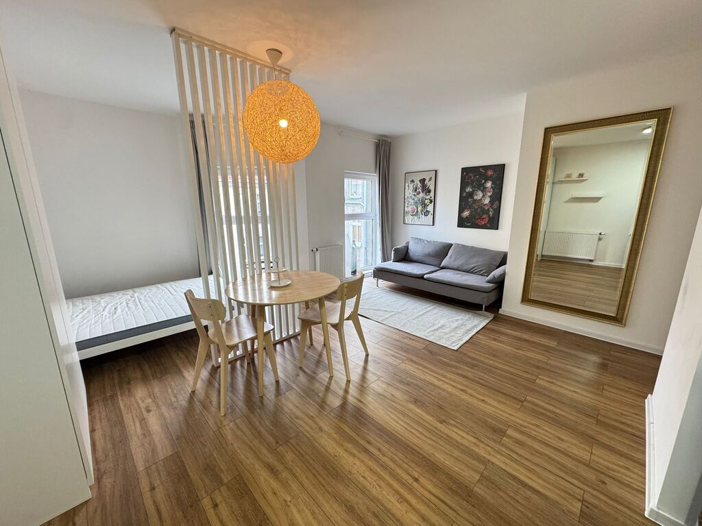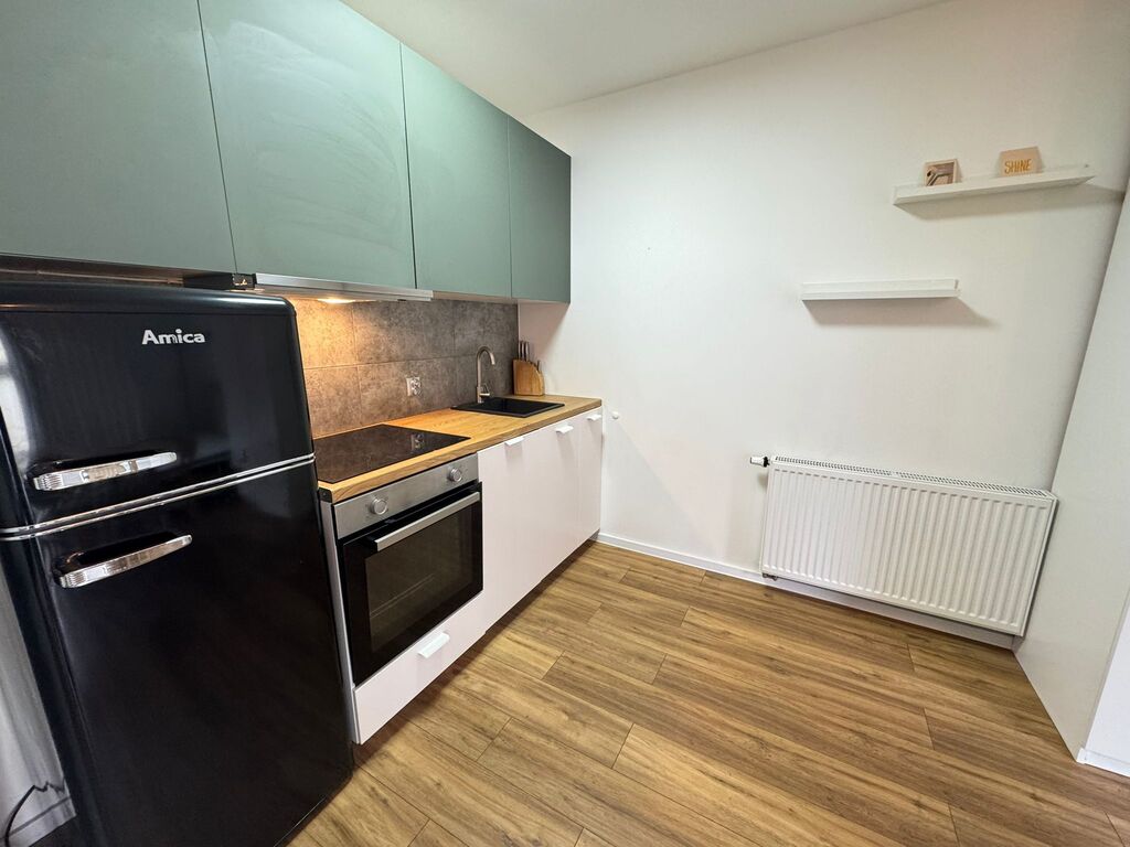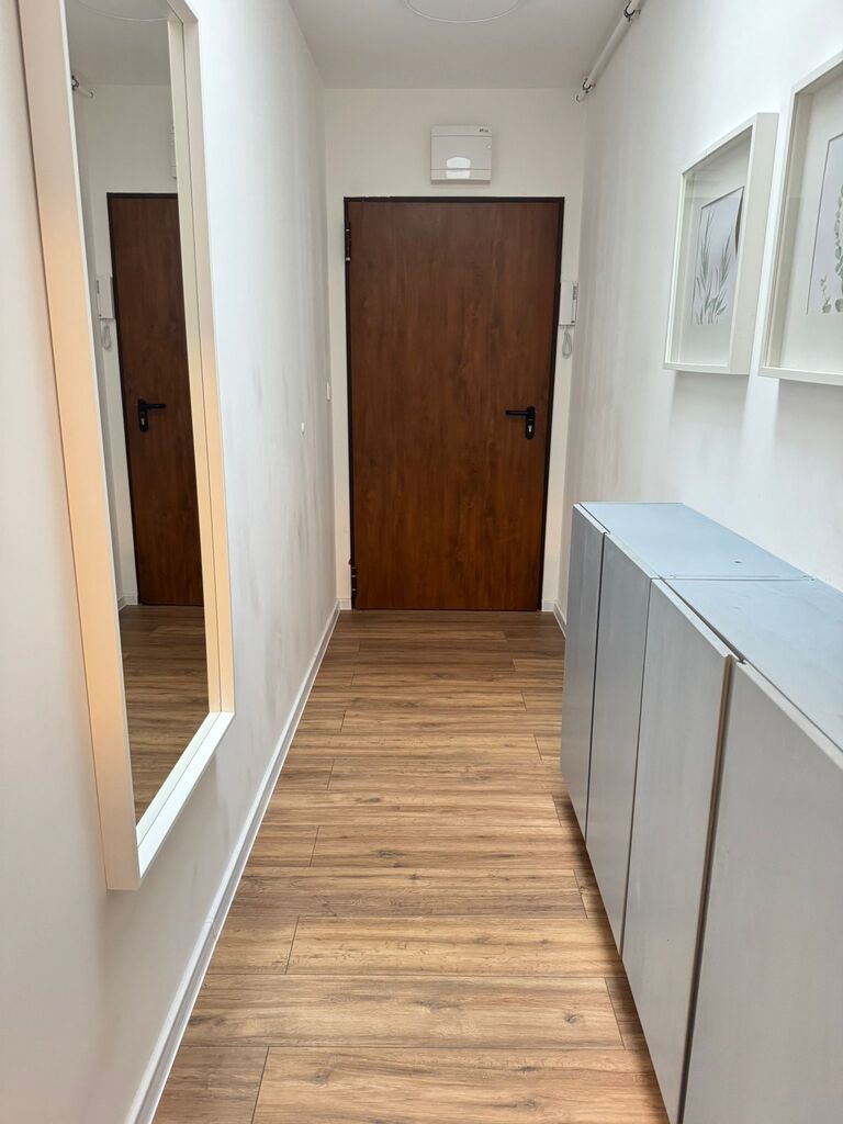 - Układ: Komfortowy pokój dzienny z aneksem kuchennym, stylowa łazienka z prysznicem oraz praktyczny przedpokój z miejscem na szafę.