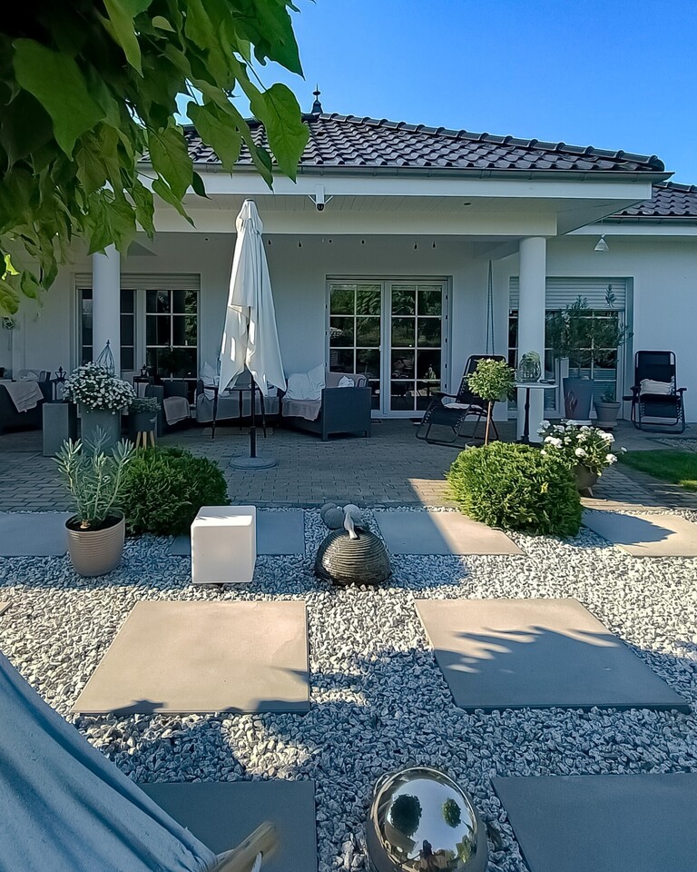Centralnym punktem ogrodu jest duży, zadaszony taras, który w sezonie letnim staje się luksusową strefą wypoczynkową.