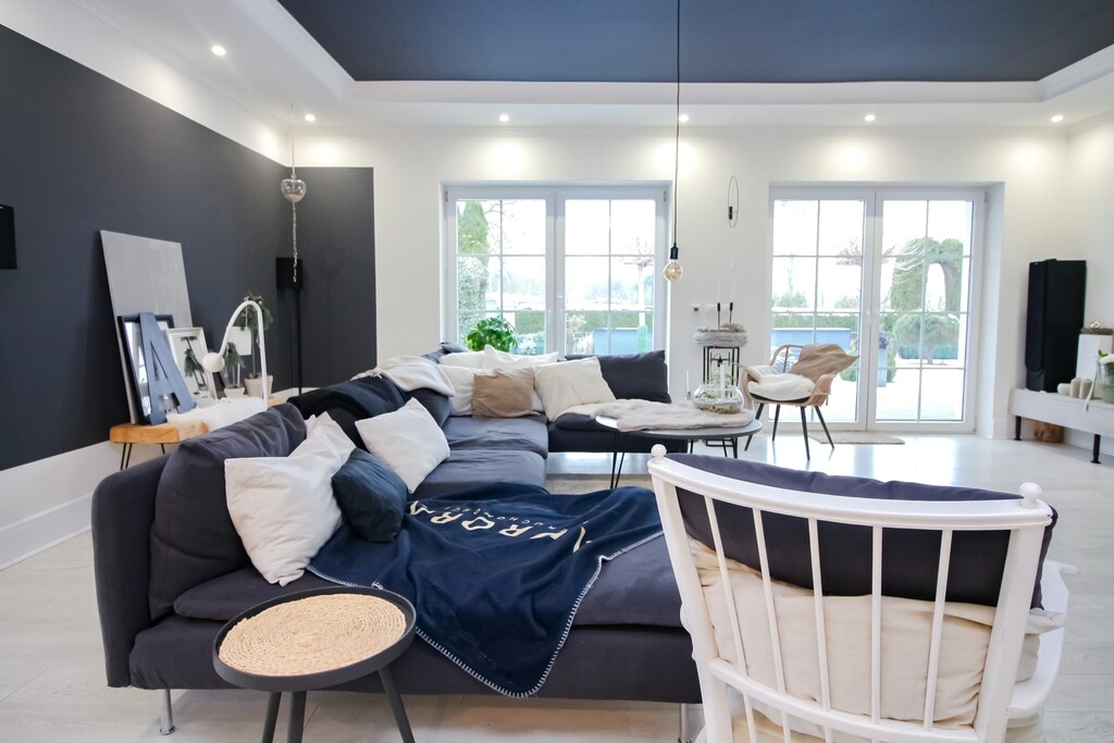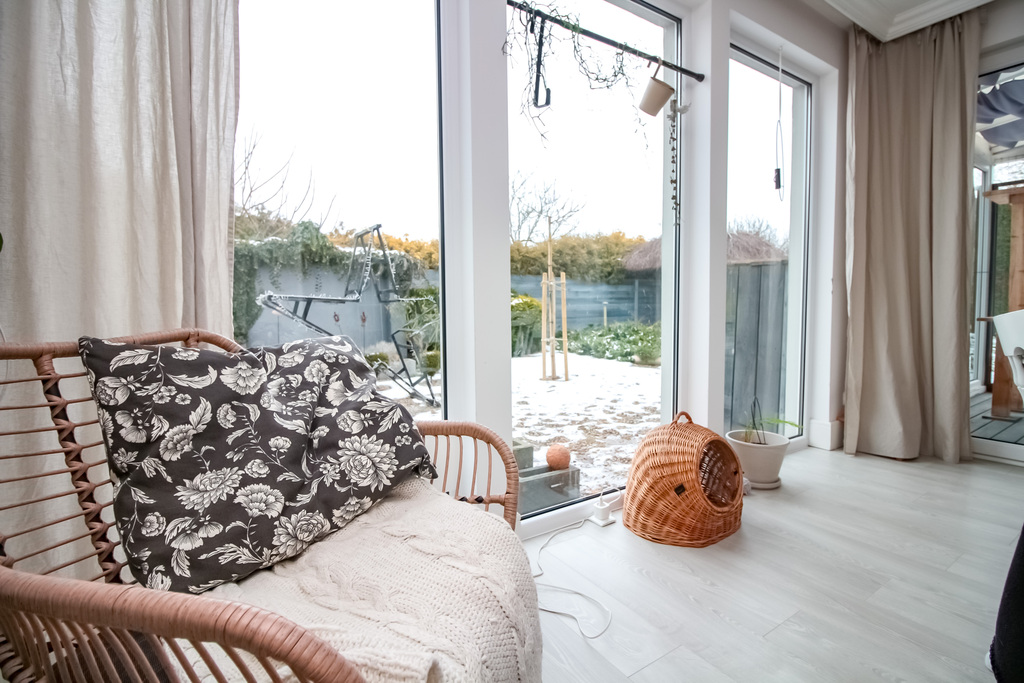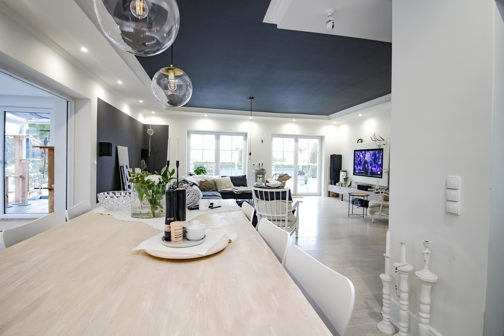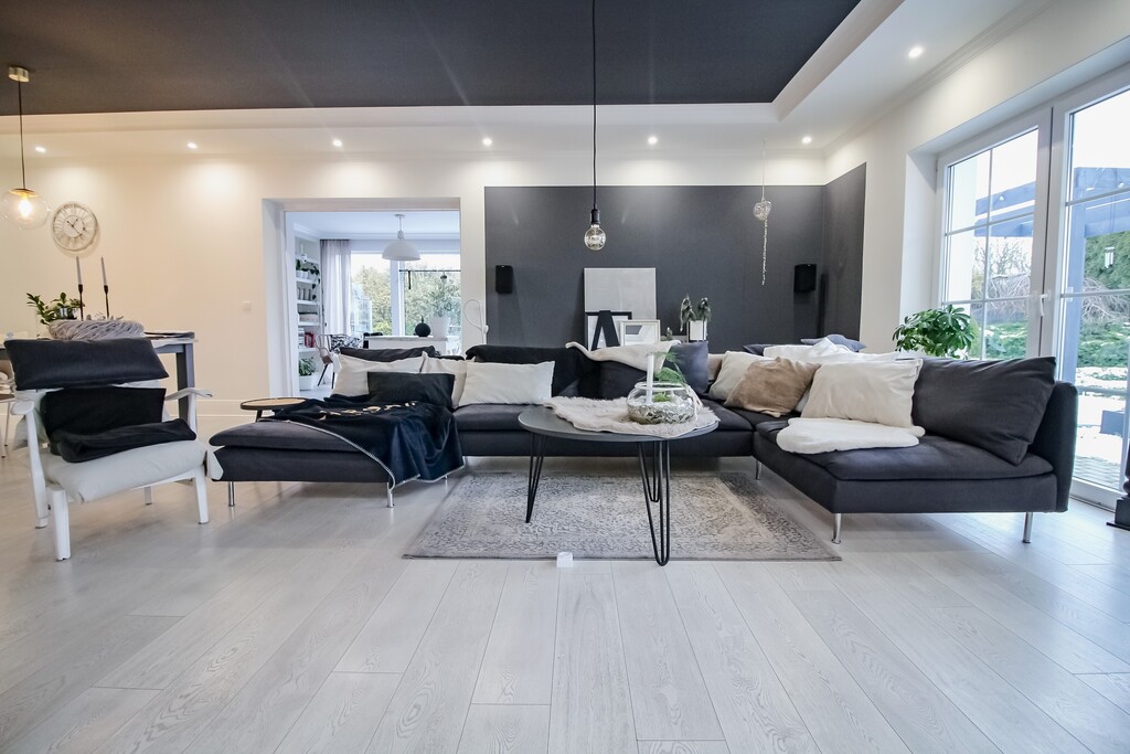 - salon z dużymi przeszkleniami i pięknym widokiem na ogród ,