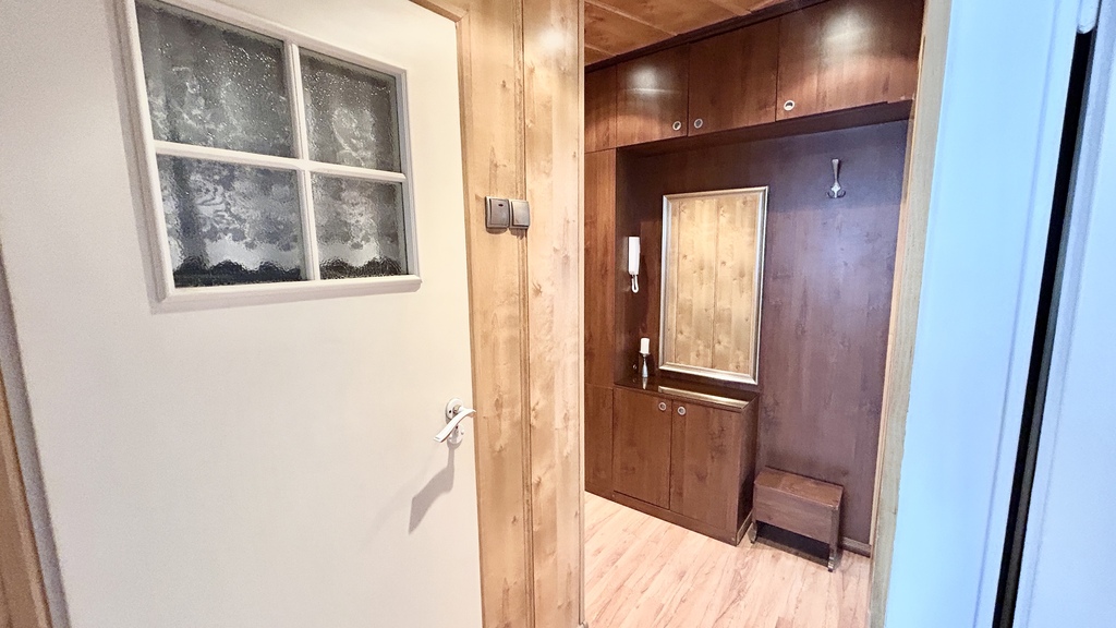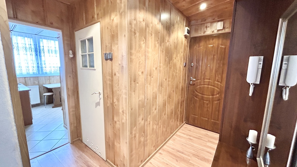 W mieszkaniu na podłogach znajdują się panele, ściany tapetowane, łazienka w glazurze i terakocie.