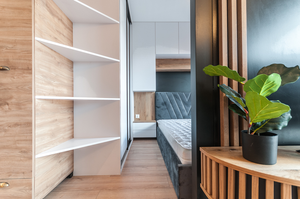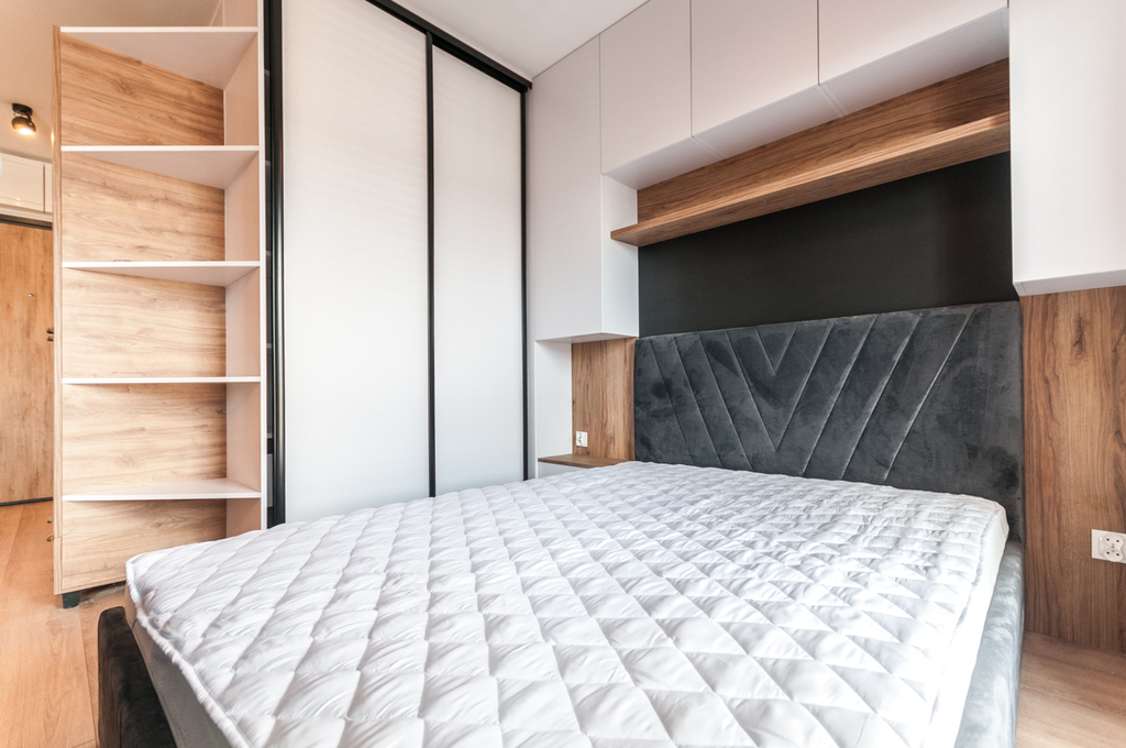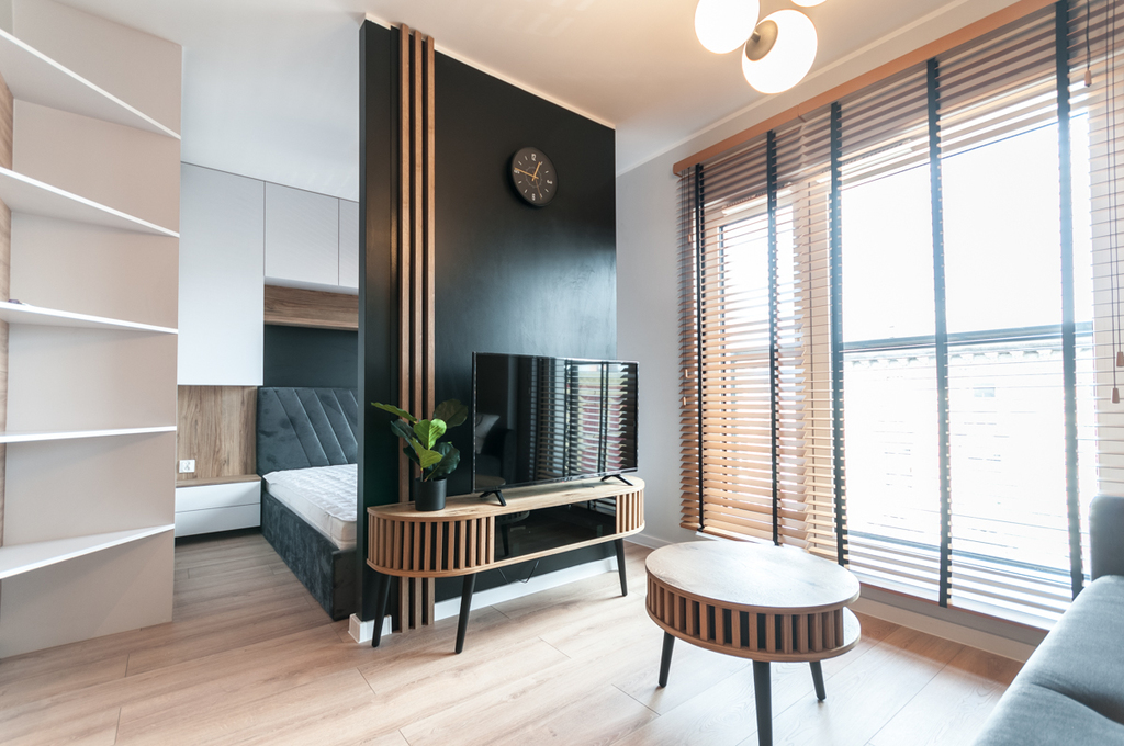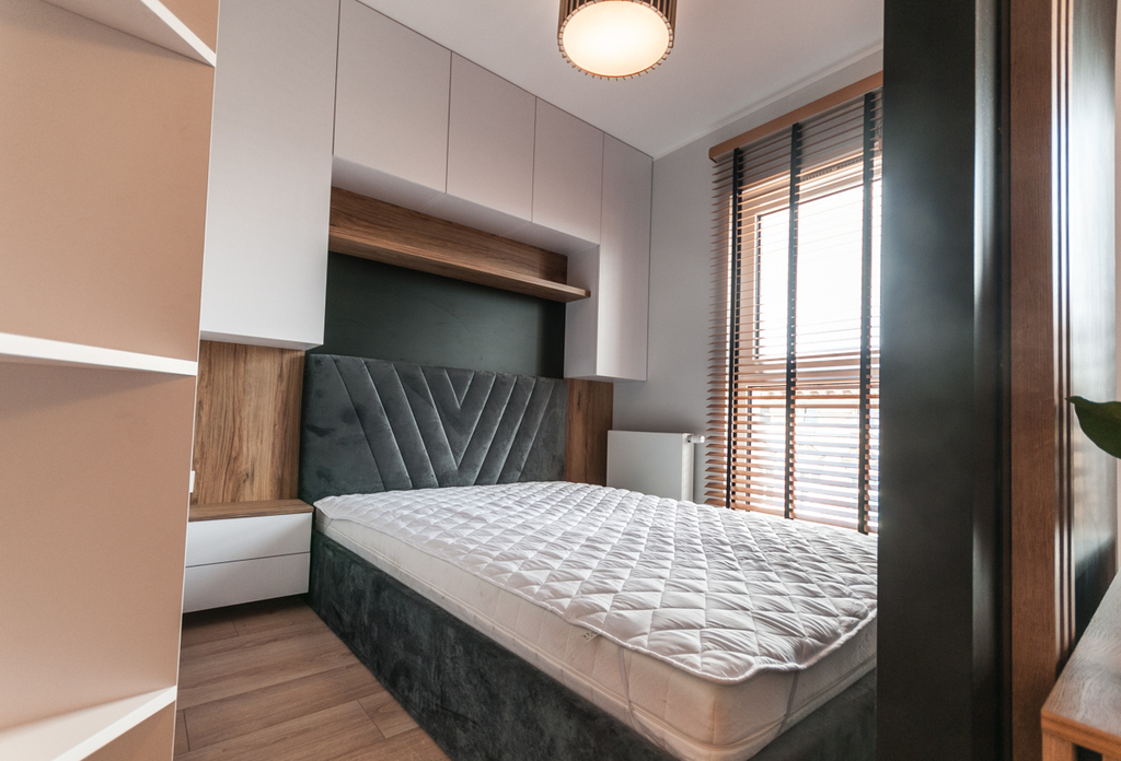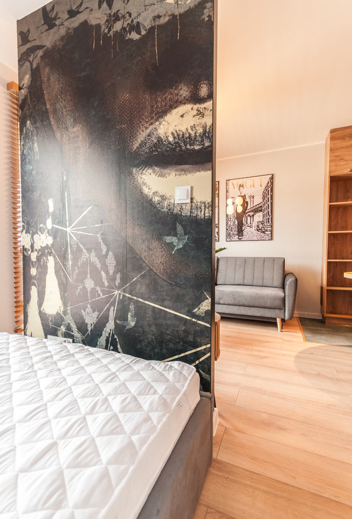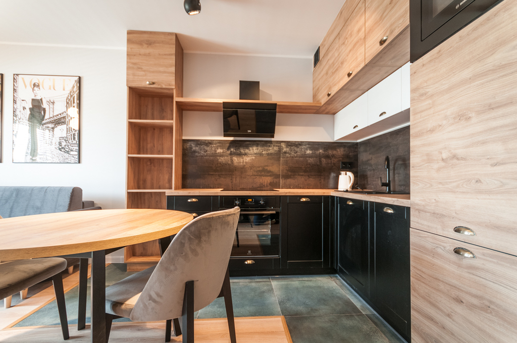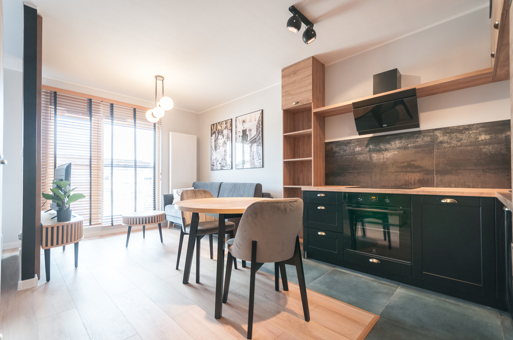 Mieszkanie posiada część dzienną z aneksem kuchennym, stołem do spożywania posiłków oraz z częścią na odpoczynek przed TV. Do tego za ścianką wydzielona część sypialniana z szafą i półkami na przechowywanie rzeczy. Meble w zabudowie z lodówką, zmywarką, okapem, płytą grzewczą, piekarnikiem i mikrofalówką. W szufladach dostępne talerze, sztućce itp. Na wyposażeniu pozostaje również żelazko, deska do prasowania, odkurzacz