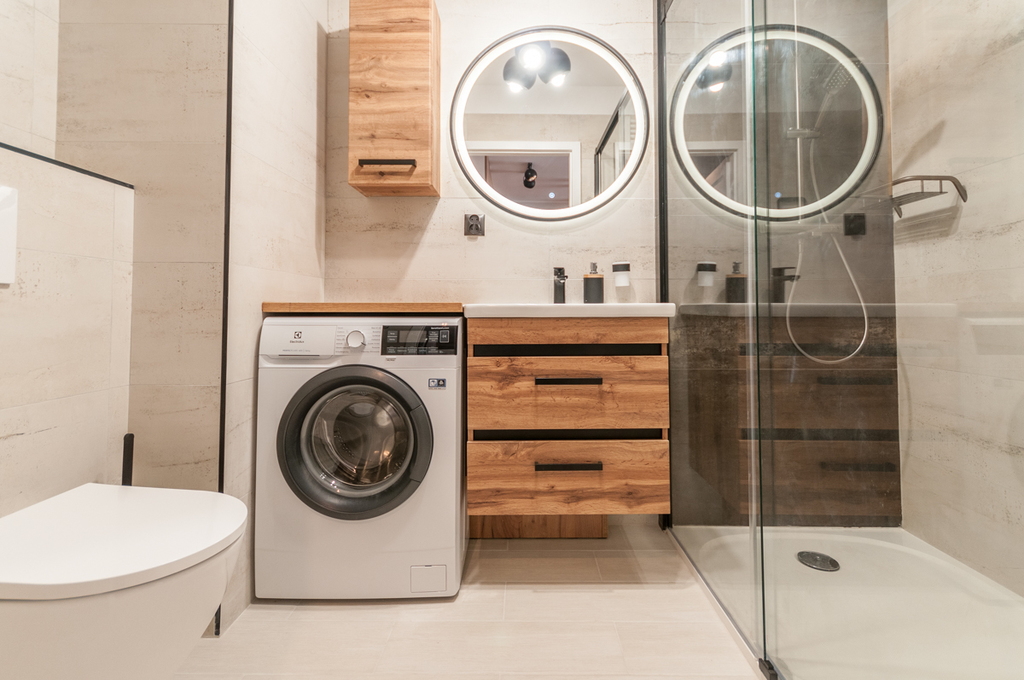 Atrakcyjna łazienka z dużą kabiną prysznicową, pralką.