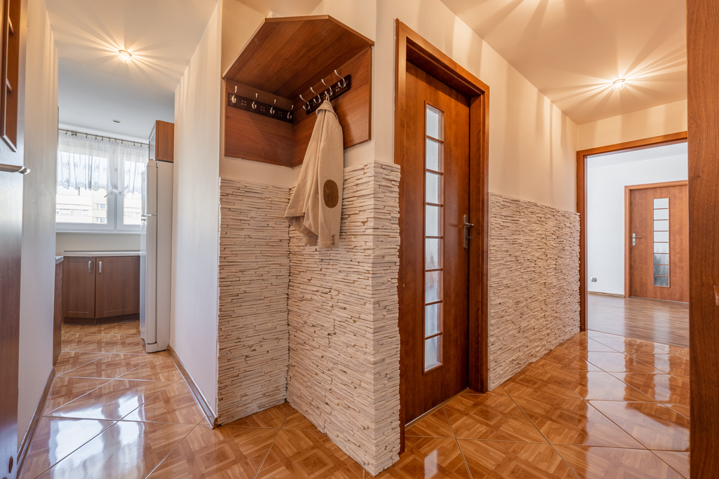 Mieszkanie zawiera 3 pokoje, wyposażone w kanapy, biurka, komody i szafy. Kuchnia wyposażona we wszelkie niezbędne sprzęty: kuchenka gazowa, piekarnik, okap, zmywarka, lodówko-zamrażarka, zlewozmywak, pralka meble w zabudowie z dużą ilością miejsca do przechowywania rzeczy. W łazience duża wanna, WC, obszerne lustro, szafki z dużą ilością miejsca. W przedpokoju znajduje się dodatkowo duża szafa typu komandor.