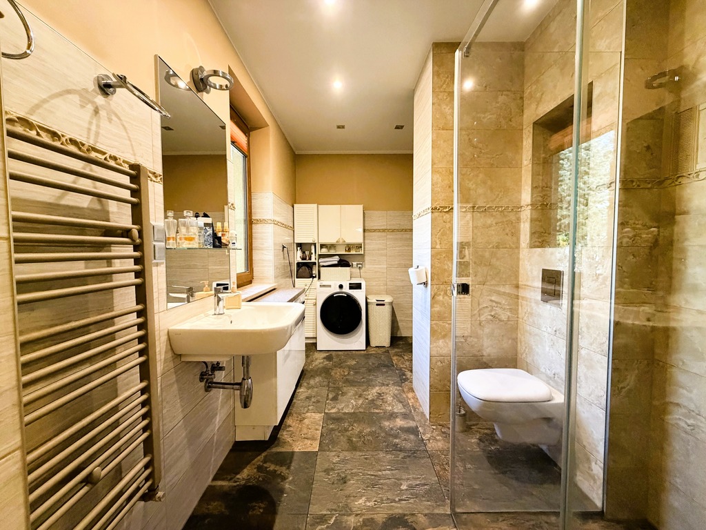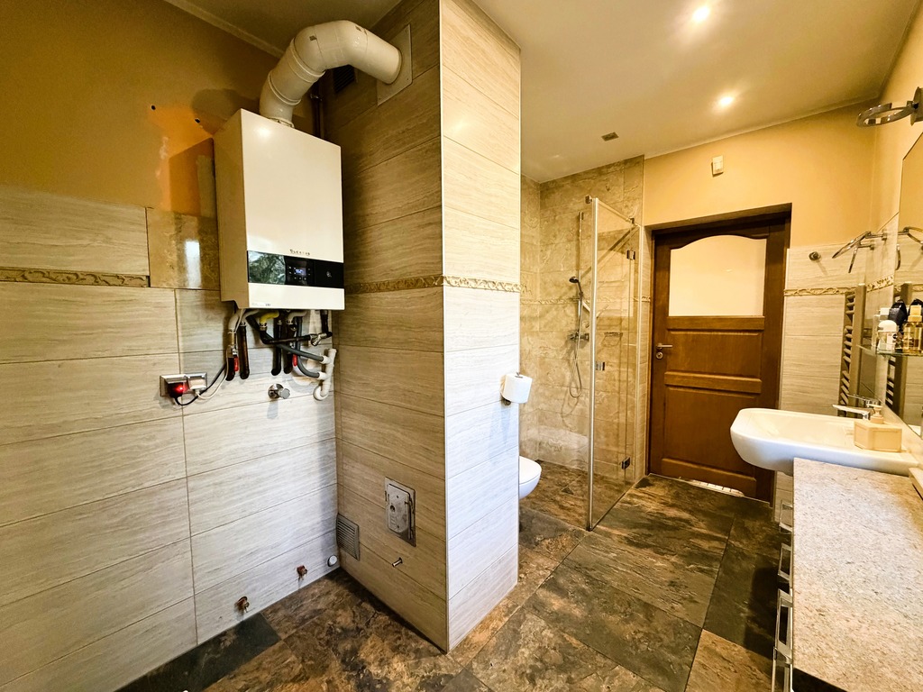 - duża łazienka z oknem z prysznicem typu walk-in, toaletą, umywalką i częścią gospodarczą (pralnia i nowy, niespełna roczny piec dwubiegowy marki Buderus),