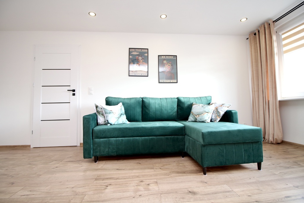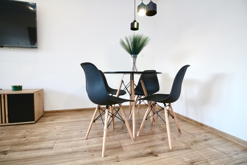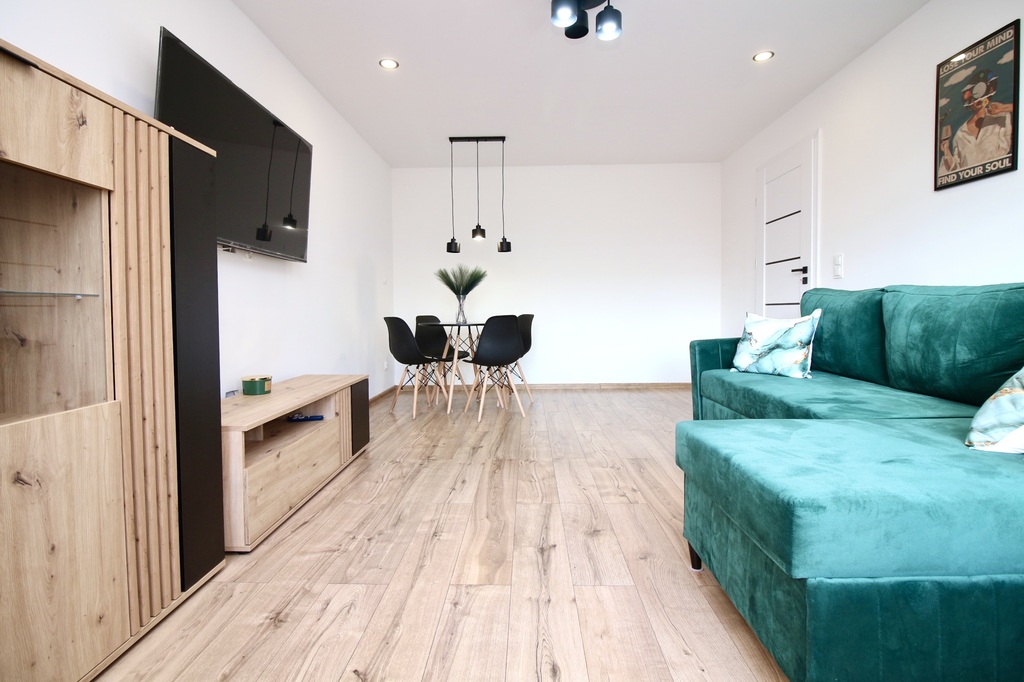Mieszkanie jest w pełni wyposażone – w cenie pozostaje kompletne umeblowanie oraz nowy sprzęt AGD i RTV, objęty gwarancją.