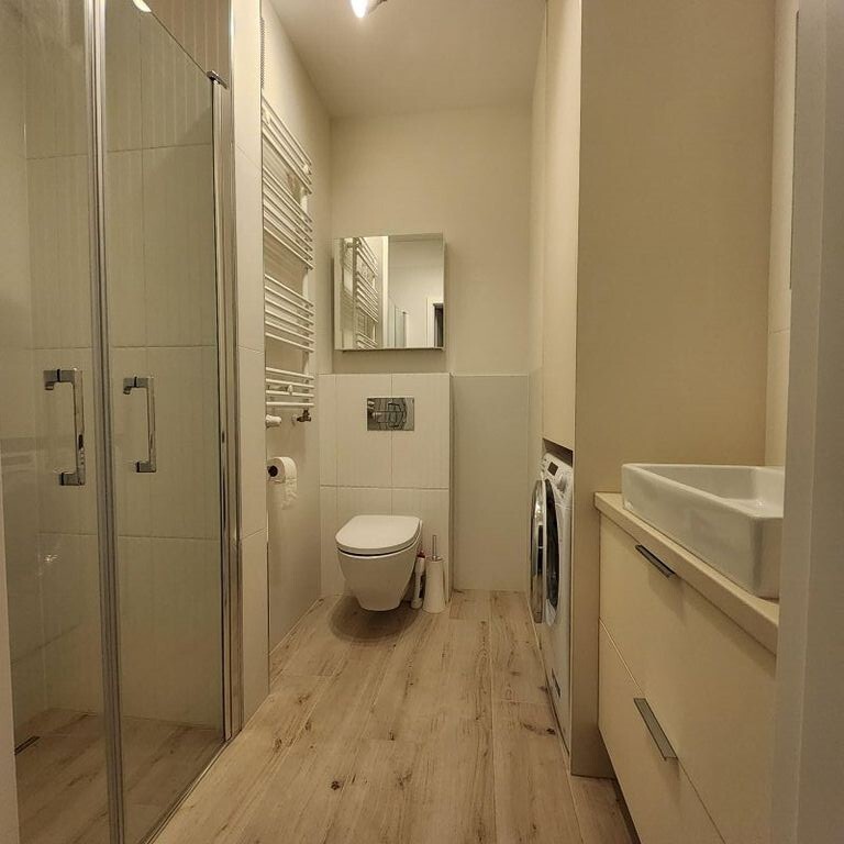 Kuchnia w pełni wyposażona w sprzęt AGD: lodówka, zmywarka, kuchenka, piekarnik, pralka. Mieszkanie posiada okna PCV. Ogrzewanie i ciepła woda z pieca gazowego.