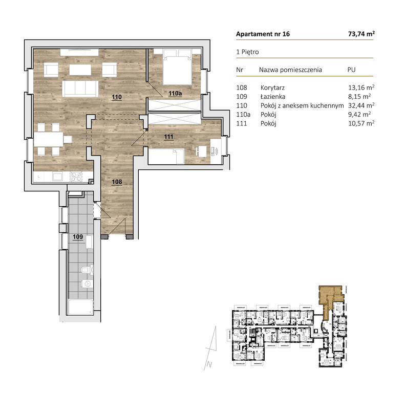 Przedmiotowe mieszkanie nr 16 trzypokojowe o powierzchni całkowitej 73,74mkw składa się z:
