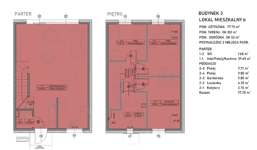 - dwie przytulne sypialnie (7,77m2, 9,80m2)
