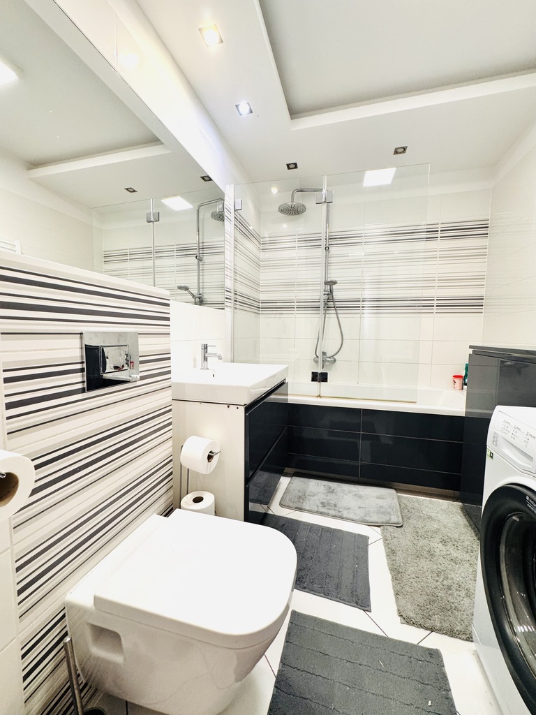 - łazienki ok. 5 m2 wyposażonej w wannę z funkcją prysznica, oraz ogrzewaną podłogę,