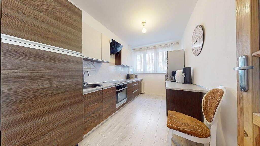 Ściany gładzone, malowane, podłogi wyłożone ładnymi panelami. Łazienka z dużym prysznicem i miejscem na pralkę, wykończona glazurą i terakotą. Wc osobno w  jasnych kaflach. Duża kuchnia wyposażona w meble na wymiar i sprzęt AGD. Okna PCV, drzwi antywłamaniowe. W korytarzu i sypialni duże szafy w zabudowie. Mieszkanie jest ciepłe i jasne, a balkon wychodzi na zieleń.