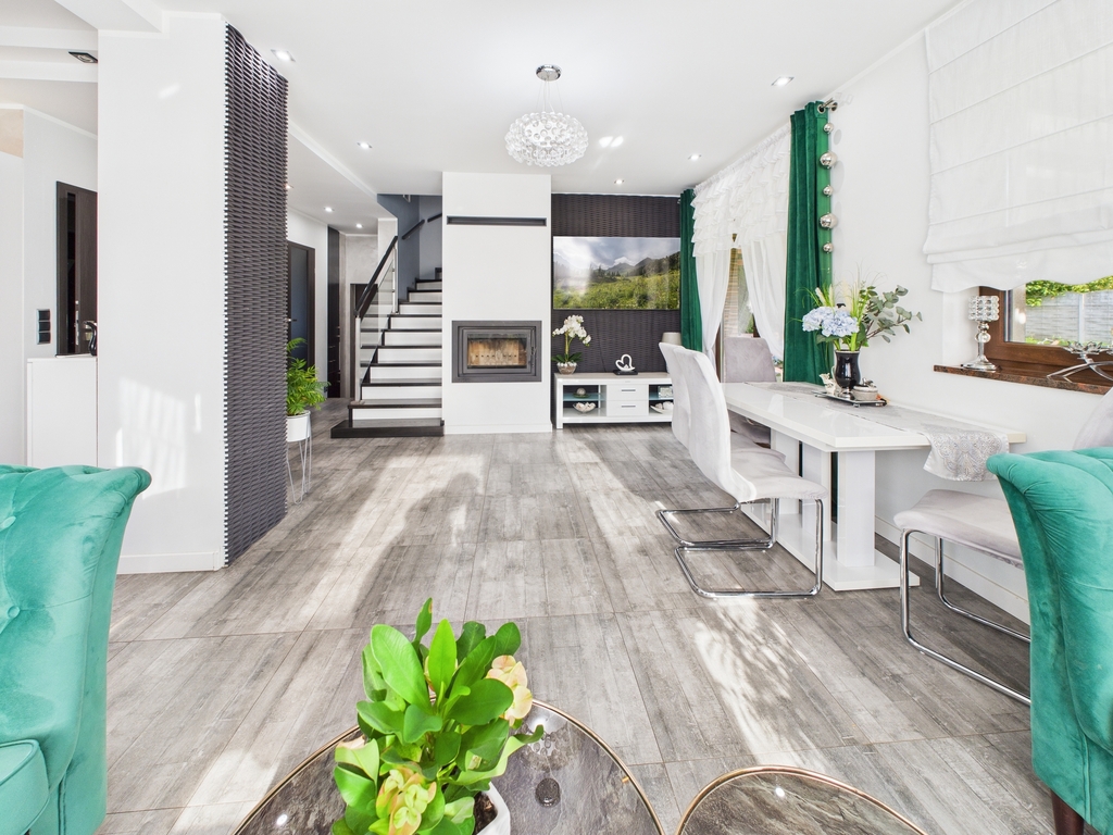* przestronny i jasny salon z kominkiem i wyjściem na taras,