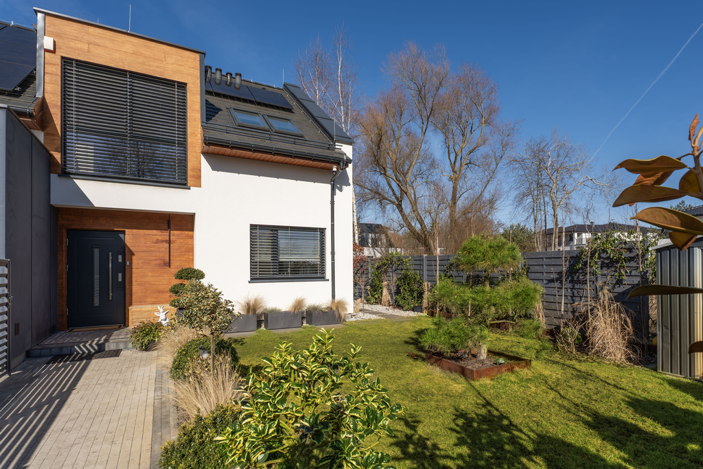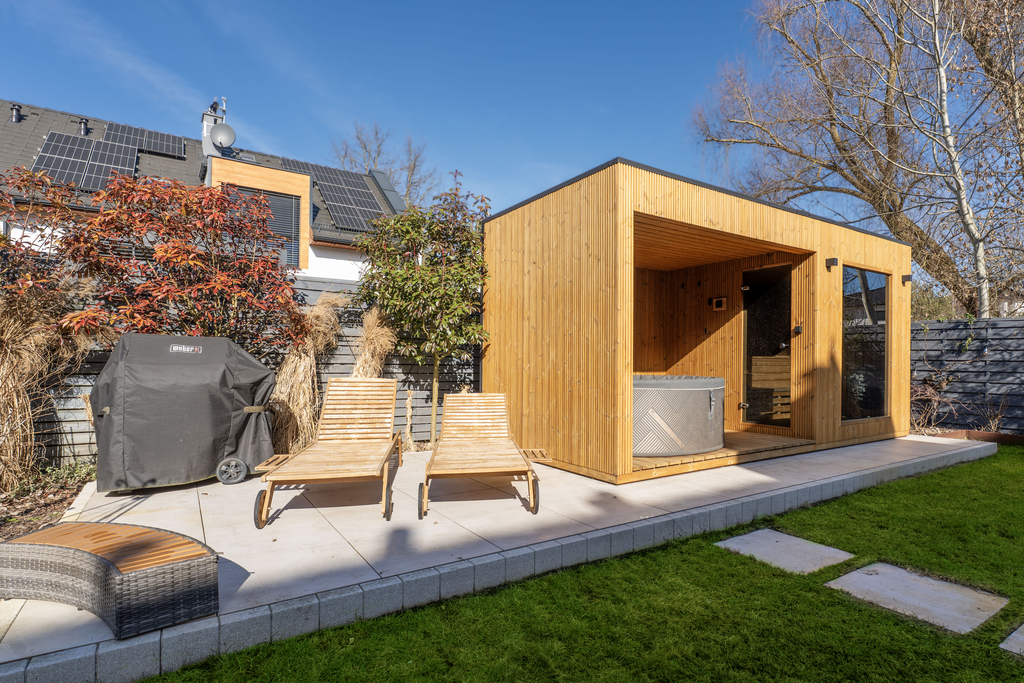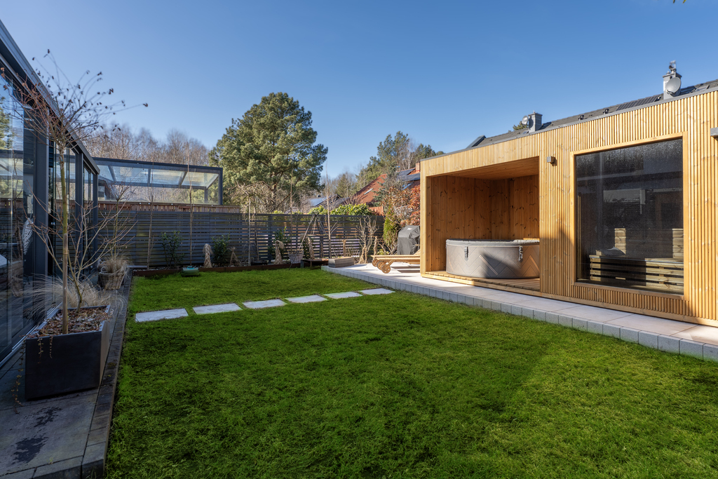 W ogrodzie znajduje się prywatna strefa wypoczynkowa z zewnętrzną sauną oraz jacuzzi – doskonałe miejsce do odprężenia po intensywnym dniu. Ogród został starannie zagospodarowany, zapewniając prywatność i komfort użytkowania.