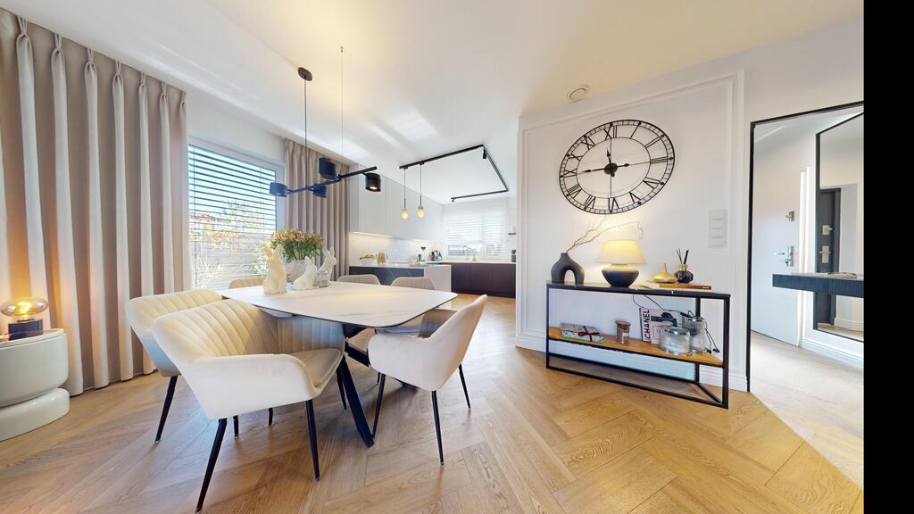 Dom oferuje przestronny i funkcjonalny układ pomieszczeń, idealny dla rodziny. Jasne wnętrza zostały zaprojektowane tak, aby zapewnić maksymalną wygodę codziennego życia. Duże przeszklenia doskonale doświetlają pokoje a zimowy ogród, stanowi idealne miejsce do relaksu przez cały rok.
