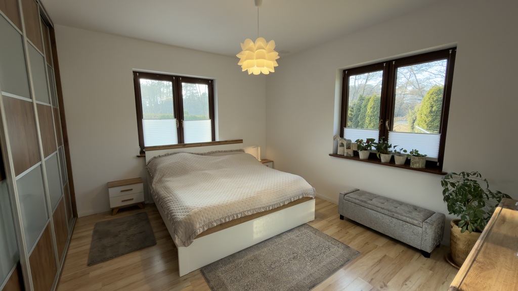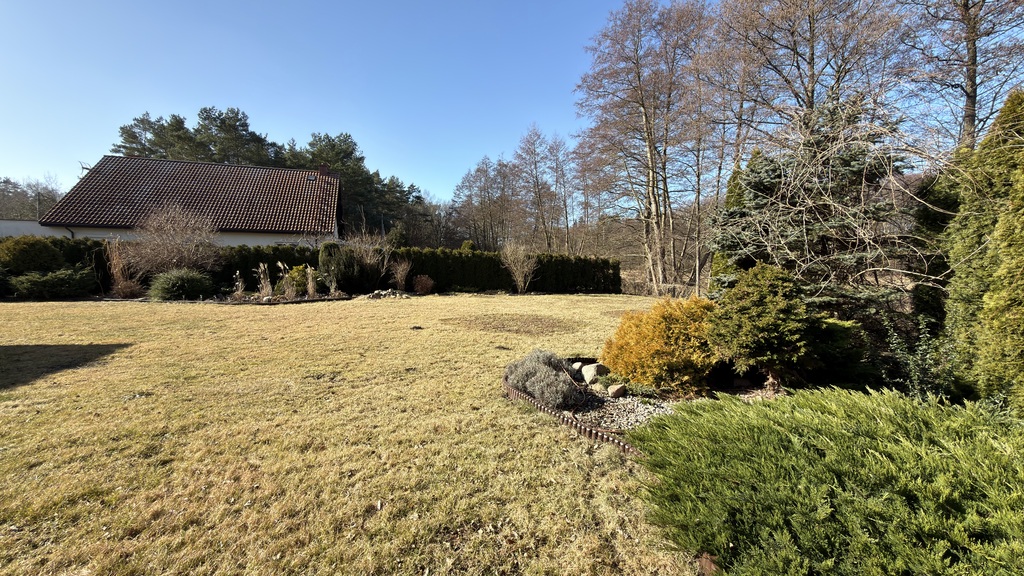 Dom położony jest na pięknie zagospodarowanej działce o powierzchni 1626 m2. Nieruchomość otacza dużo zieleni, a bezpośrednio na działce liczne nasadzenia, które tworzą przyjemną, prywatną przestrzeń do wypoczynku. W bezpośrednim sąsiedztwie działki znajduje się spokojna rzeczka, a za nią łąka i ściana lasu.
