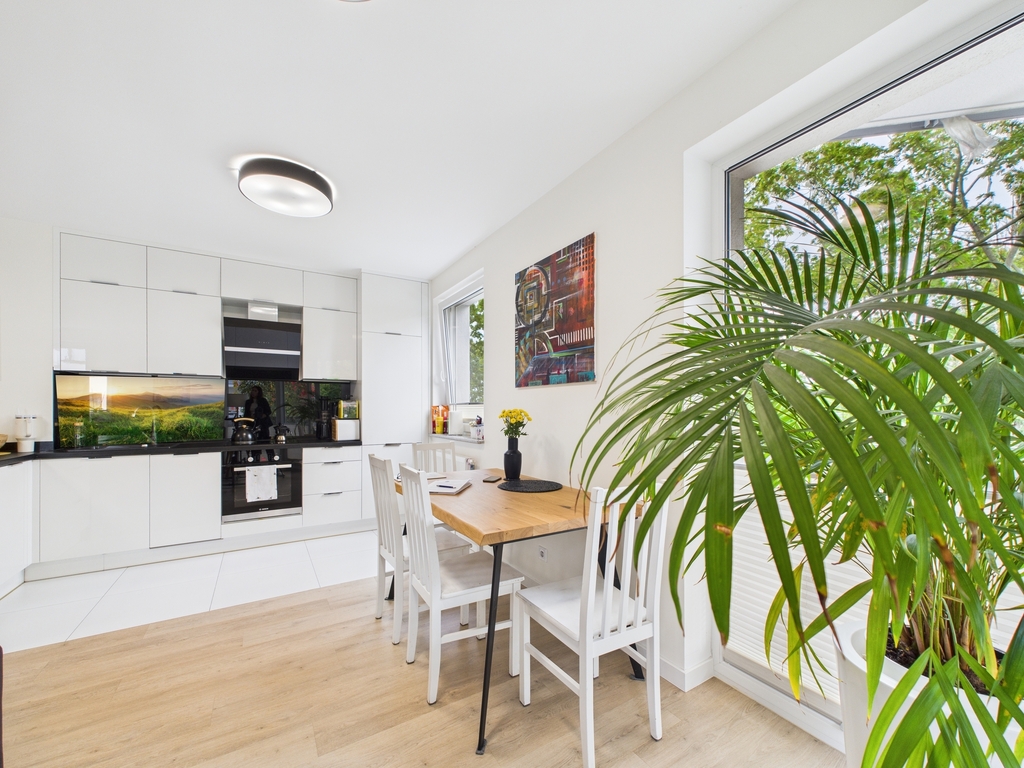 - Jasny, przestronny salon z jadalnią oraz aneksem kuchennym z bezpośrednim wyjściem na taras, z którego mamy widok na zieleń
