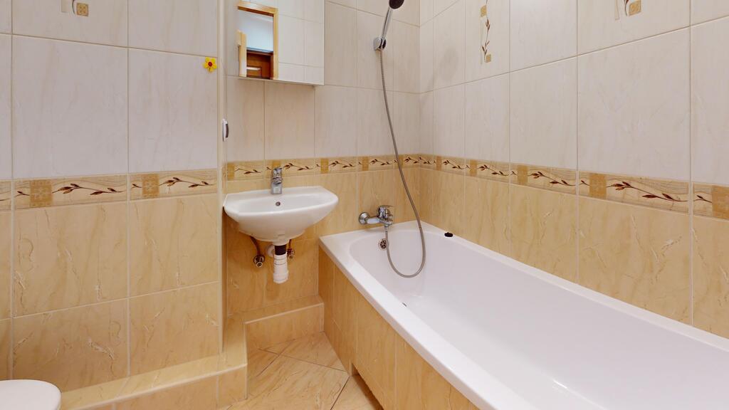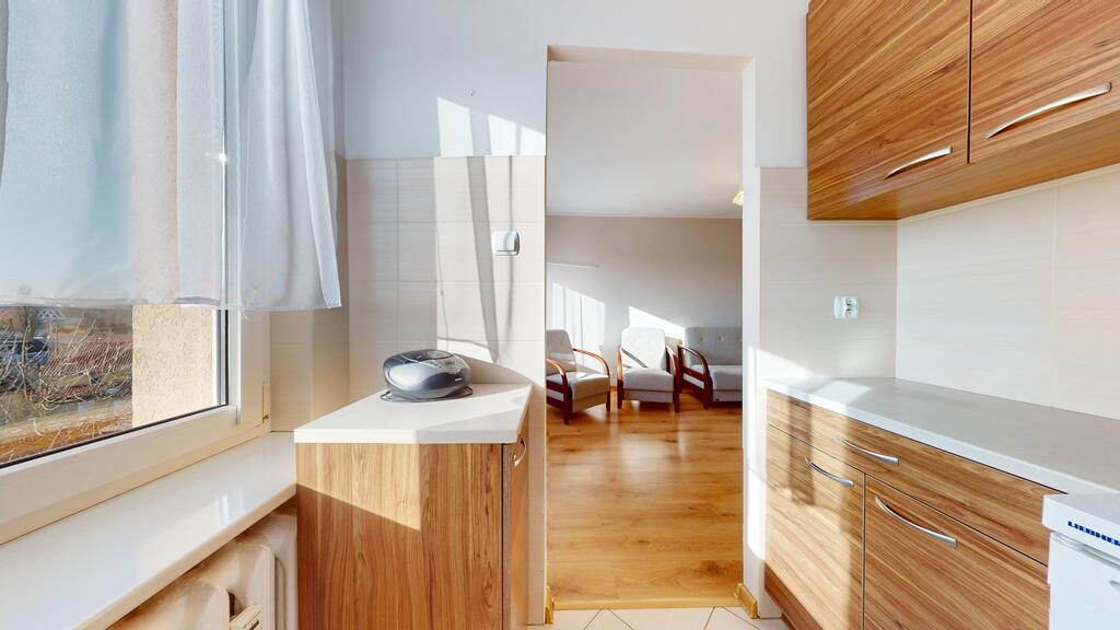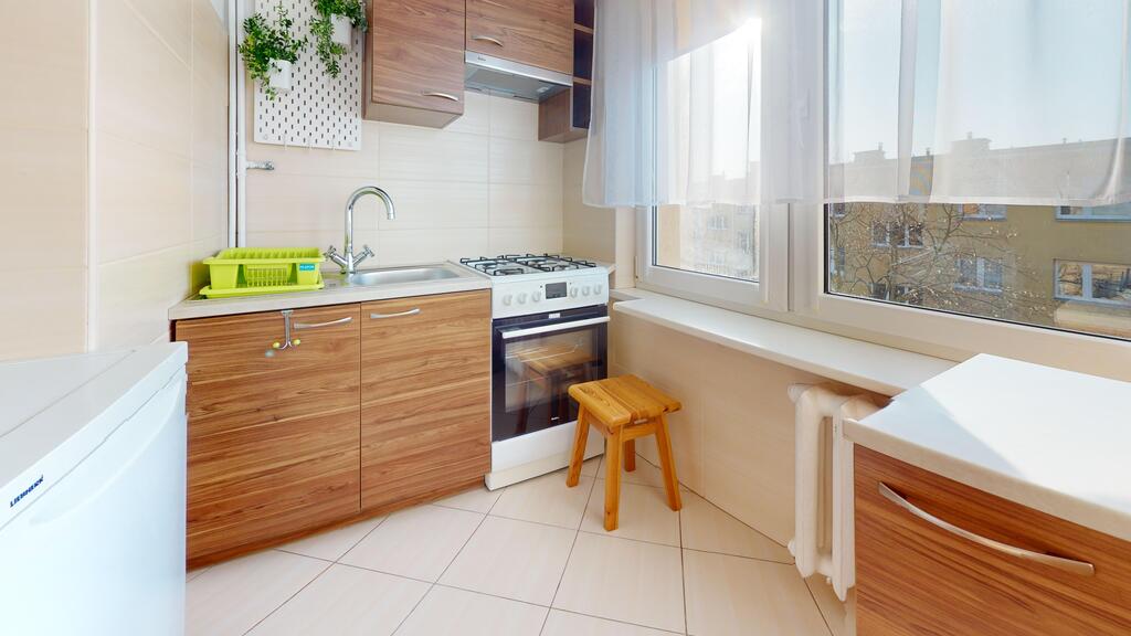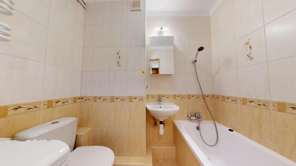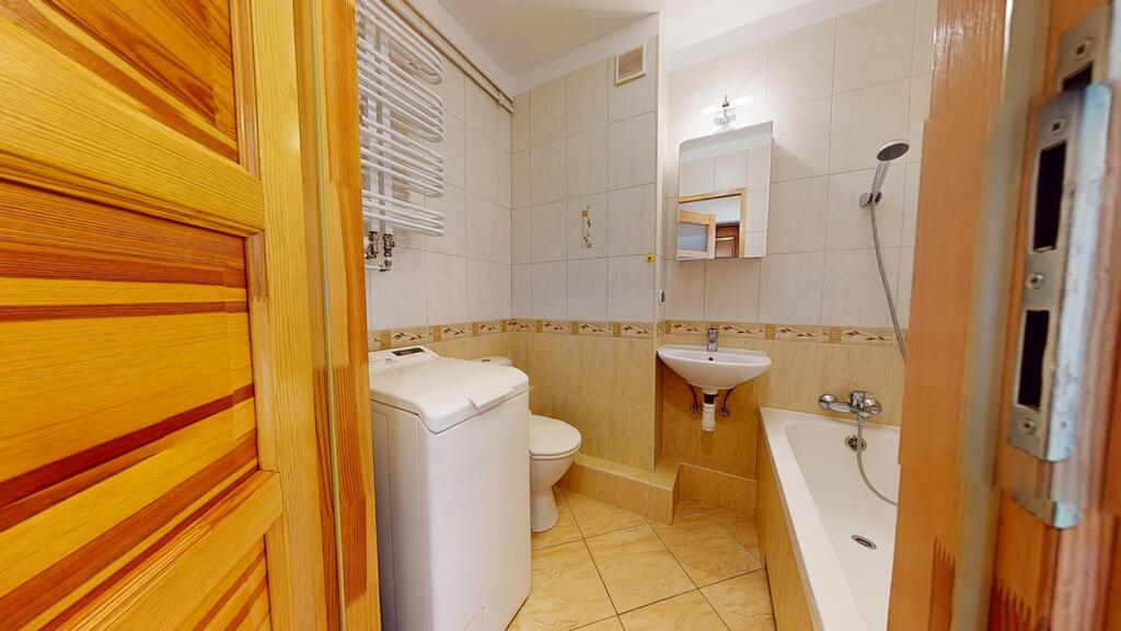 Łazienka z WC w glazurze i terakocie wyposażona w wannę. Kuchnia wyposażona w meble i sprzęt AGD w cenie mieszkania. Podłogi wykończone panelami (wcześniej wykonane pod panele nowe wylewki samopoziomujące). Czynsz administracyjny w chwili obecnej ok 350 zł (mieszkanie niezamieszkałe co powoduje brak zaliczek na zimną i ciepłą wodę po ich doliczniu na jedną osobę czynsz może wzrosnąć do ok. 400 zł). W czynszu ujęte opłaty za fundusz remontowy, ogrzewanie mieszkania, utrzymanie czystości, wywóz śmieci, administrowanie budynkiem. Zużycie gazu opłacane wg. wskazań licznika.