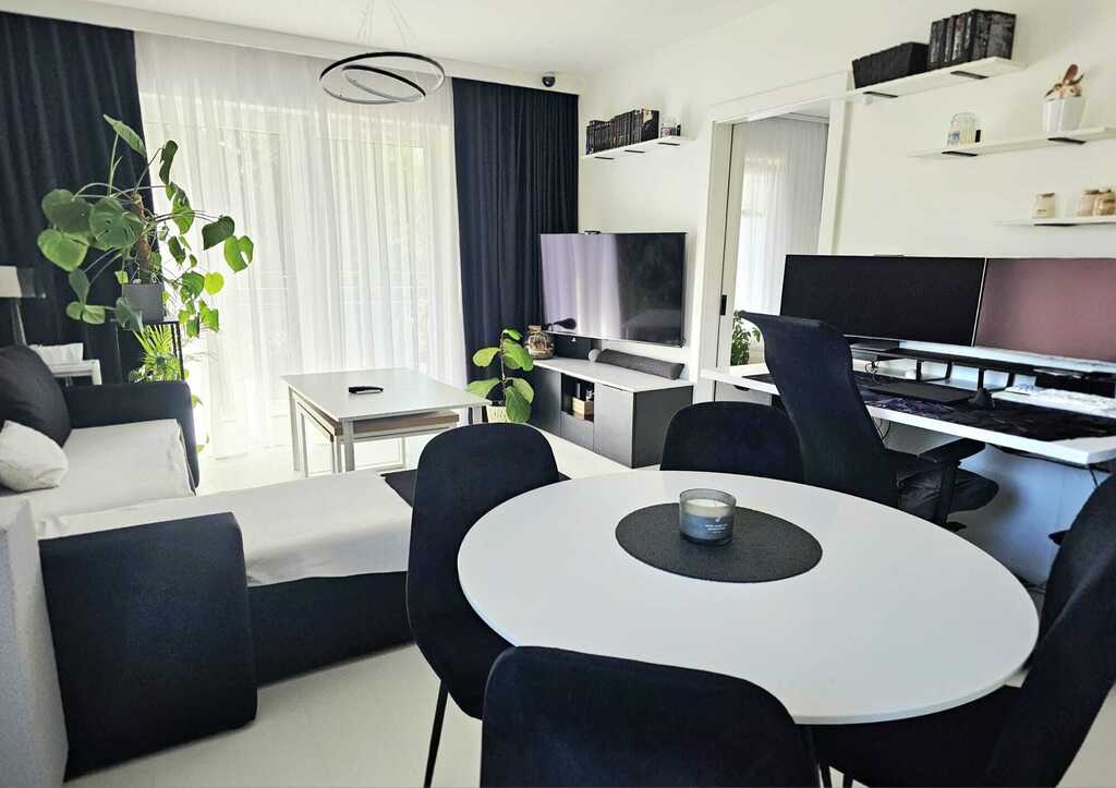 Nieruchomość położona w spokojnej okolicy, na terenie nowo powstałego osiedla mieszkalnego, przynależnego do dzielnicy Golęcino, zlokalizowana przy ulicy Strzałowskiej w Szczecinie. Bezpośredni dostęp do środków komunikacji miejskiej. Standard nieruchomości - bardzo dobry - mieszkanie doinwestowane, w przemyślany sposób zaprojektowane, kompletnie wyposażone i umeblowane, gotowe do wprowadzenia się bez konieczności ponoszenia dodatkowych nakładów finansowych. Zabudowy stałe wraz ze sprzętami RTV/AGD pozostają w cenie nieruchomości, reszta rzeczy do indywidualnego ustalenia. Mieszkanie posiada rozwiązania typu smart home (systemem Fibaro), m.in. automatyczne i zdalne zarządzanie oświetleniem, ogrzewaniem, roletami zew. czy systemami bezpieczeństwa. Centralne ogrzewanie lokalu, podłogowe na całej powierzchni mieszkania (z osiedlowej kotłowni), w łazience dodatkowo grzejnikowe. Drewniane drzwi oraz rolety zew. - antywłamaniowe. Atutem taras (ponad 11m²) oraz przynależny do mieszkania ogródek (około 60m²).