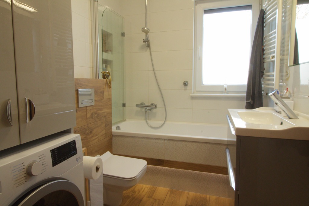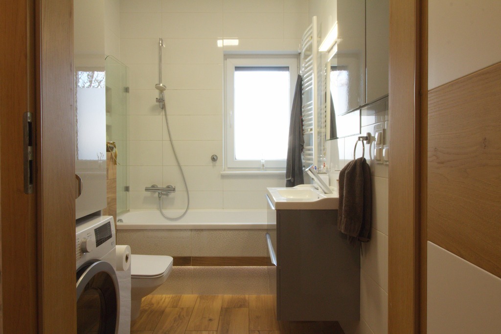 W przedpokoju wydzielono dodatkowe WC oraz przestronną zabudowaną szafę z miejscem na suszarkę.
