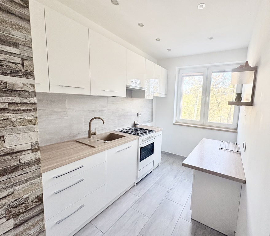 Kuchnia z oknem: Oddzielna, jasna i niedawno odświeżona. Naturalne światło i funkcjonalny układ szafek sprawiają, że to bardzo przyjemna przestrzeń.