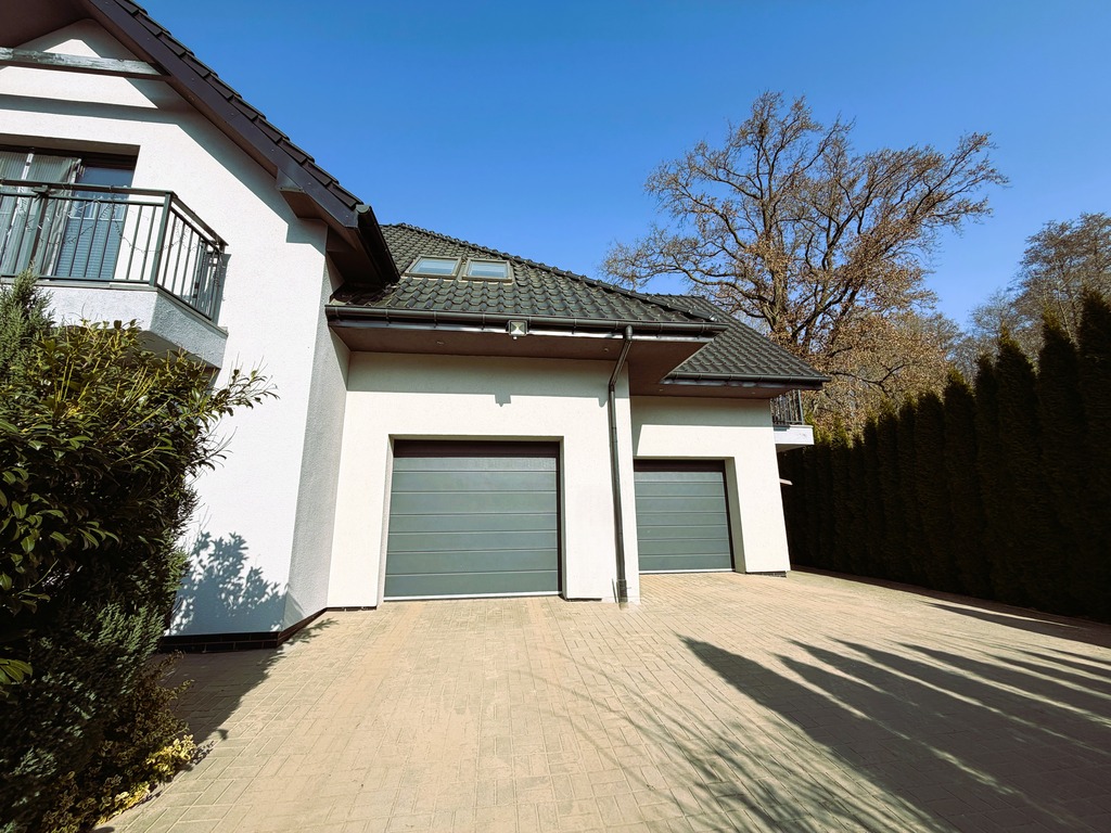 Atut stanowią dwa duże garaże (połączone, ale z osobnymi bramami wjazdowymi), dodatkowo pomieszczenie gospodarcze z piecem i miejscem do przechowania.
