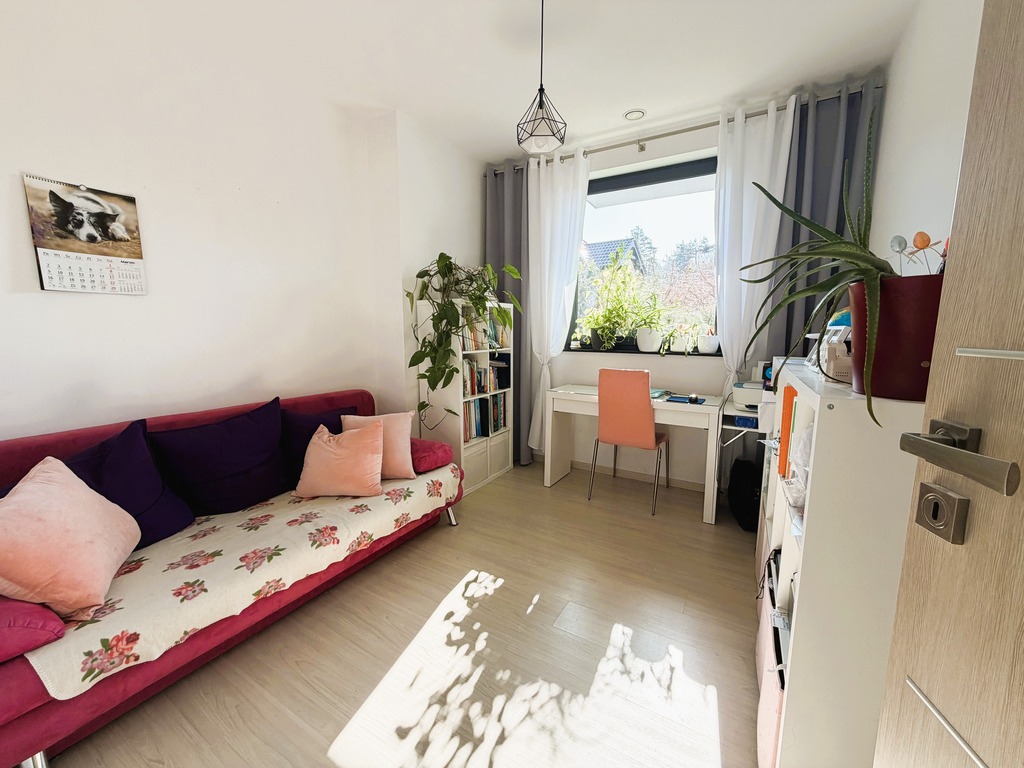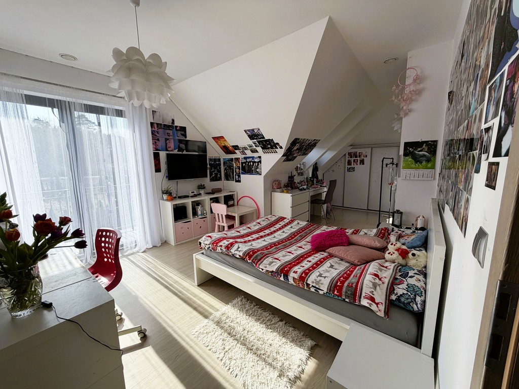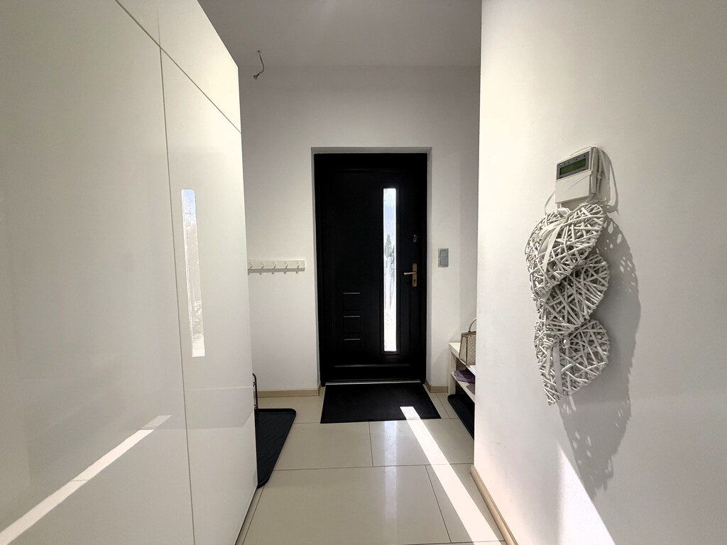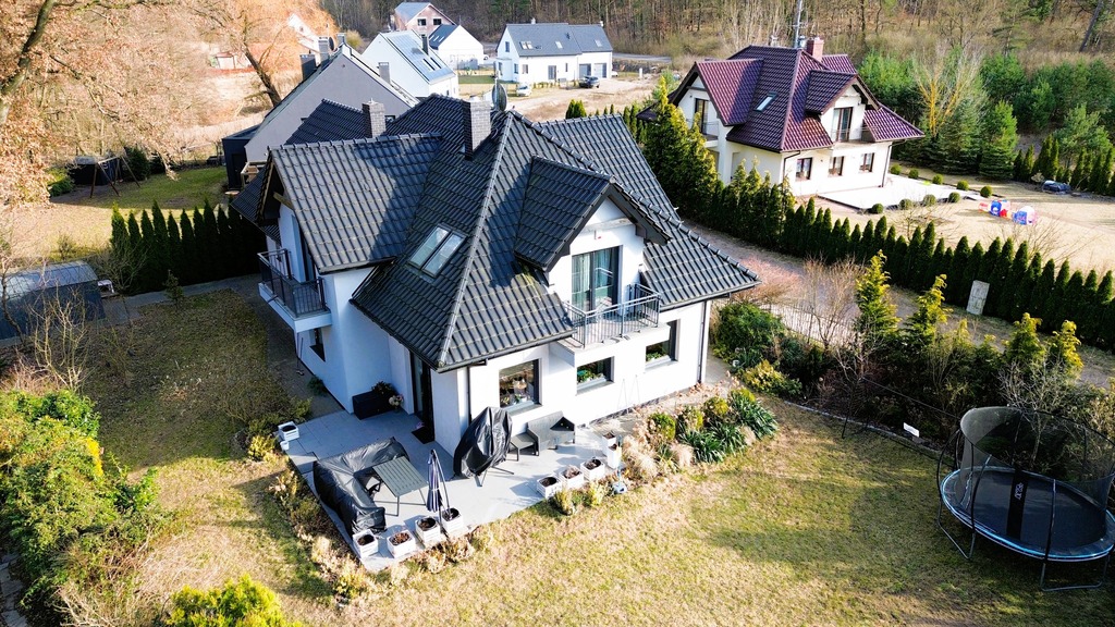 Budynek wyróżnia się jasną, estetyczną elewacją oraz wieloma oknami, zapewniającymi doskonałe doświetlenie wnętrz przez cały dzień. Przemyślany układ pomieszczeń gwarantuje wygodę codziennego życia – przestronny salon z dostępem do ogrodu, funkcjonalna kuchnia, komfortowe sypialnie oraz łazienki wykończone z dbałością o detale.