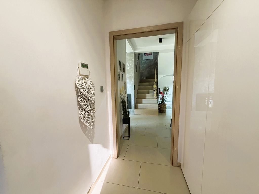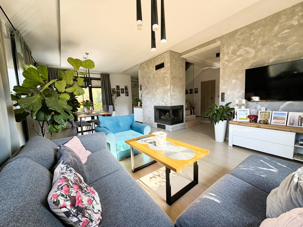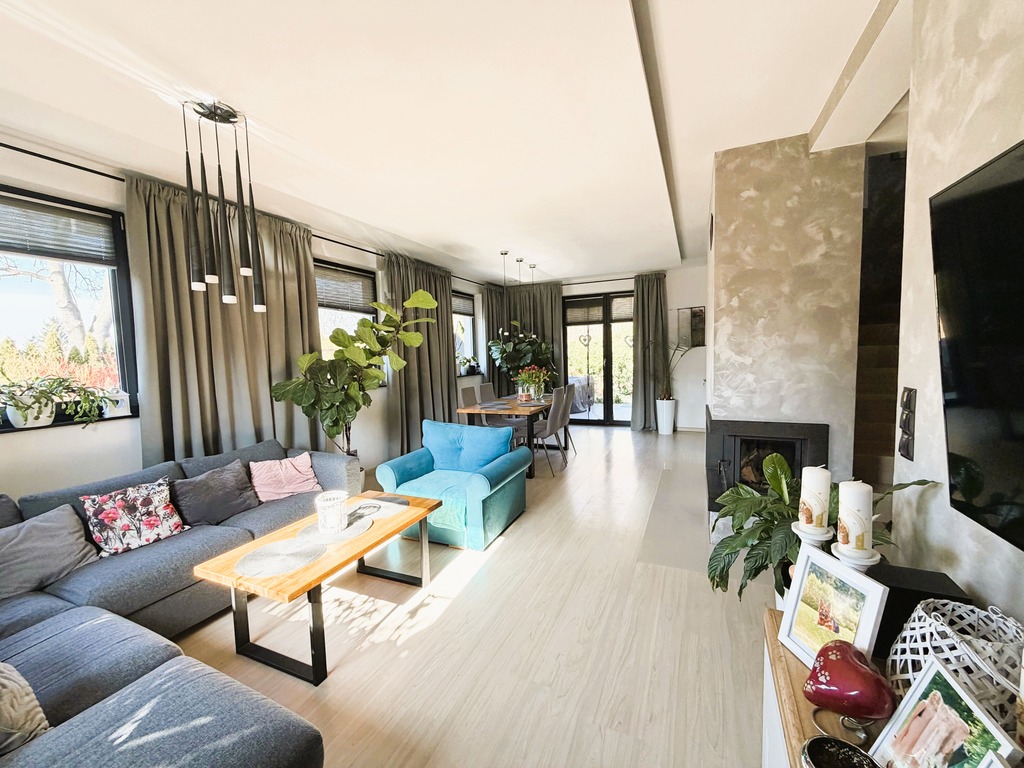 Dodatkowym atutem jest przytulny taras oraz cztery balkony, który stanowią idealne miejsce na poranną kawę lub wieczorny odpoczynek. Wnętrza domu utrzymane są w ciepłej, harmonijnej stylistyce, co tworzy atmosferę sprzyjającą relaksowi i poczuciu swojskości.