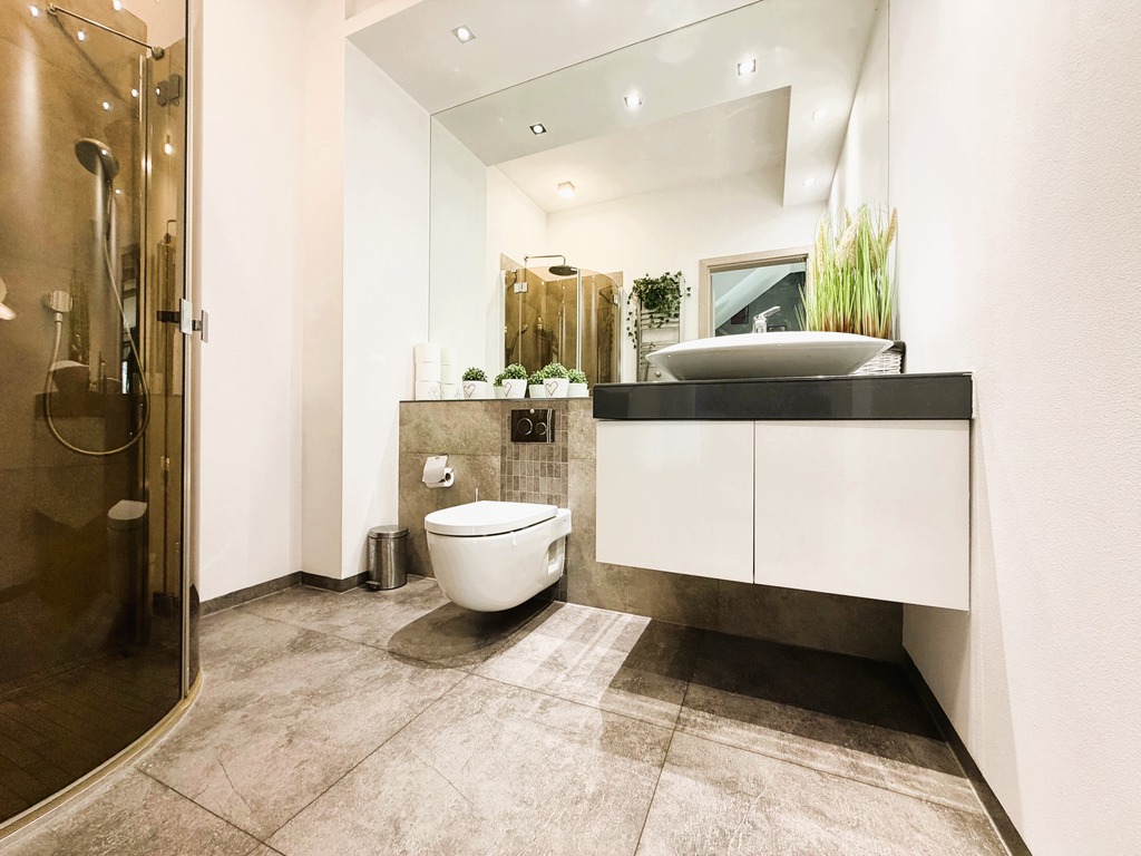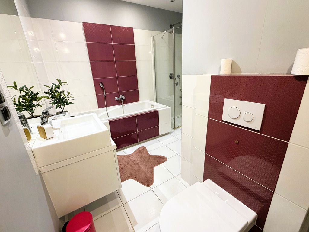 - łazienka z toaletą i prysznicem,