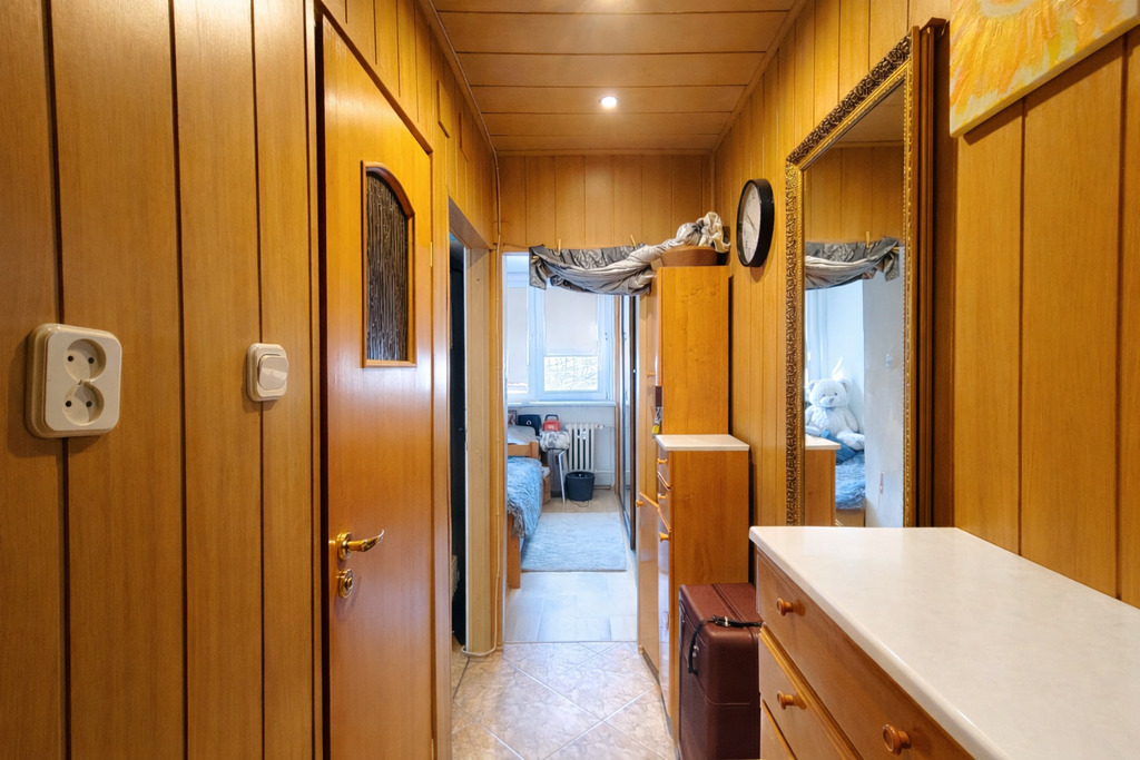 Na podłogach panele, w korytarzu panele ścienne i kafle na podłodze.