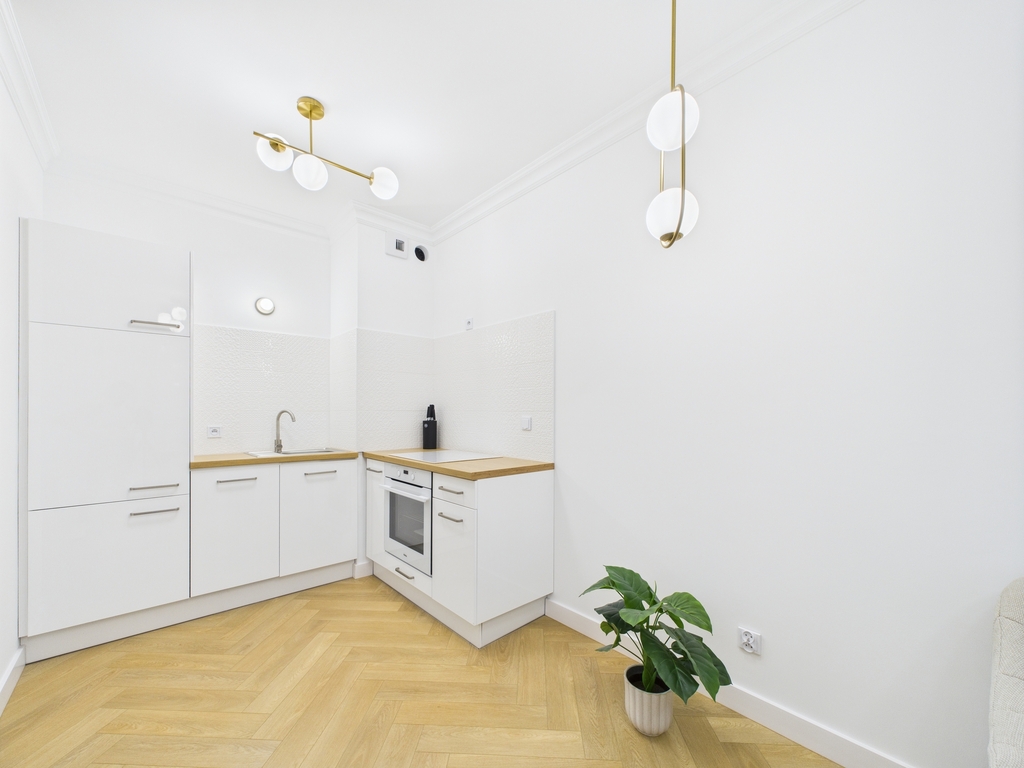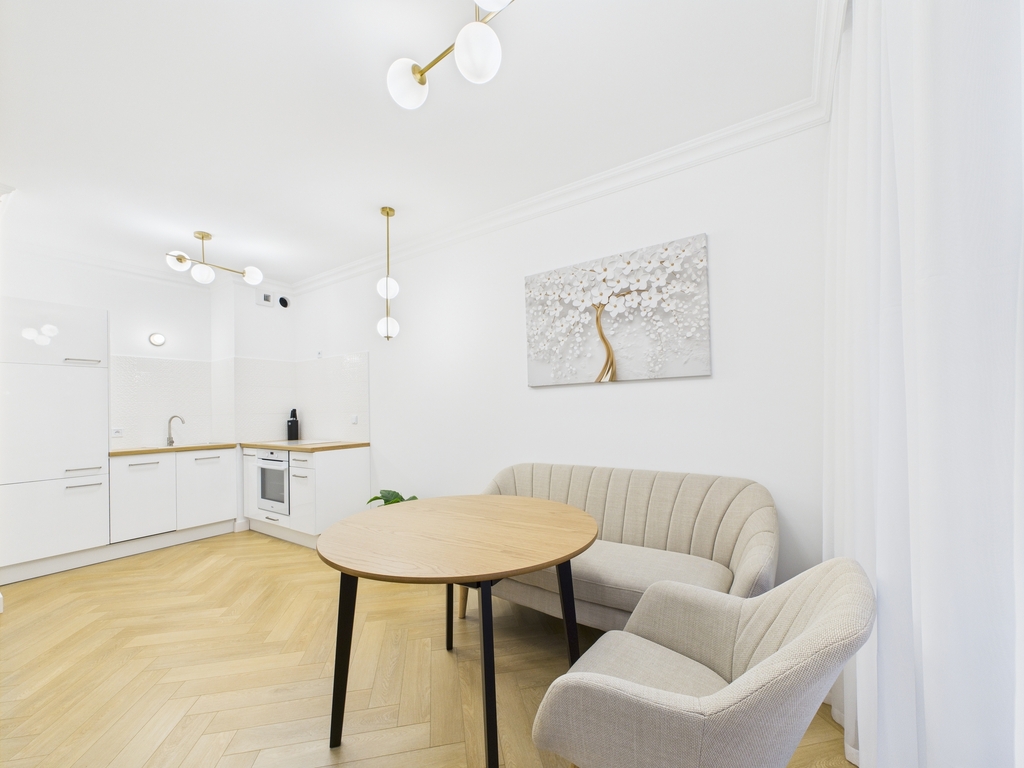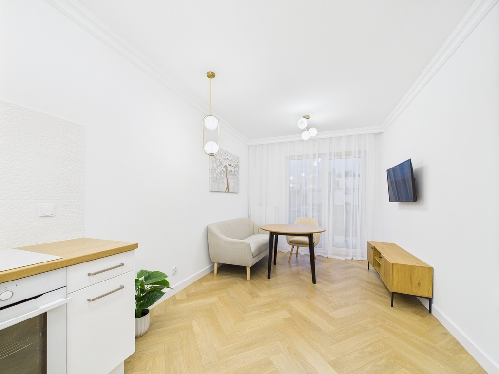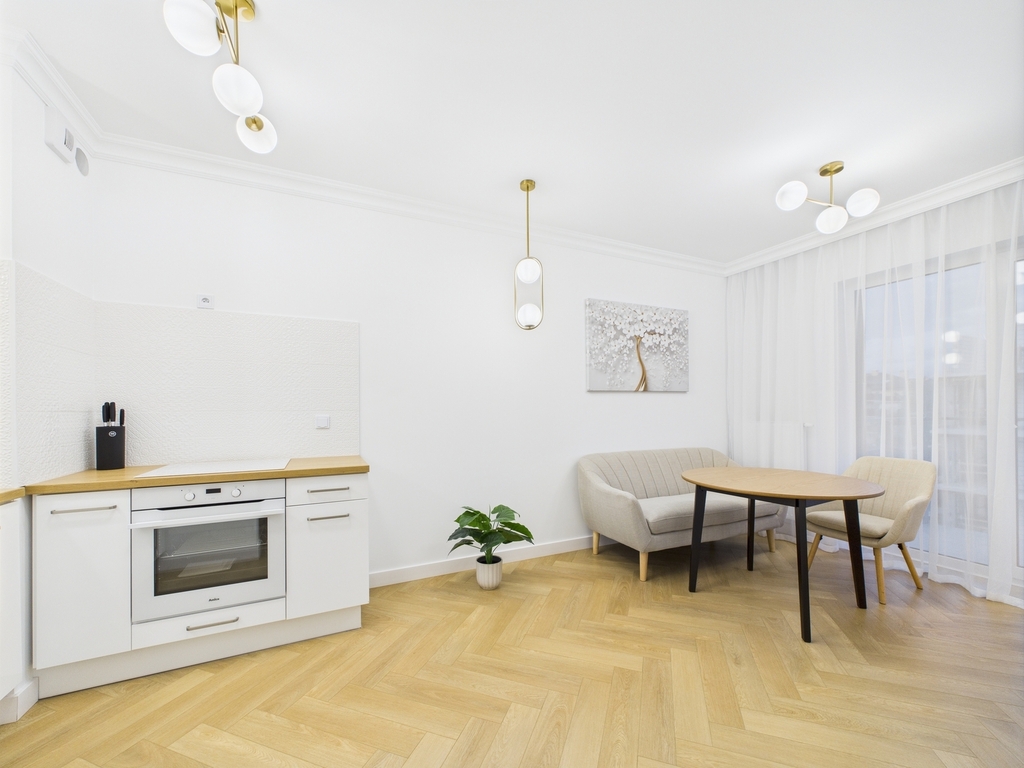 Salon z aneksem kuchennym. W cenie zostaje elegancka zabudowa mebli wraz ze sprzętem AGD.