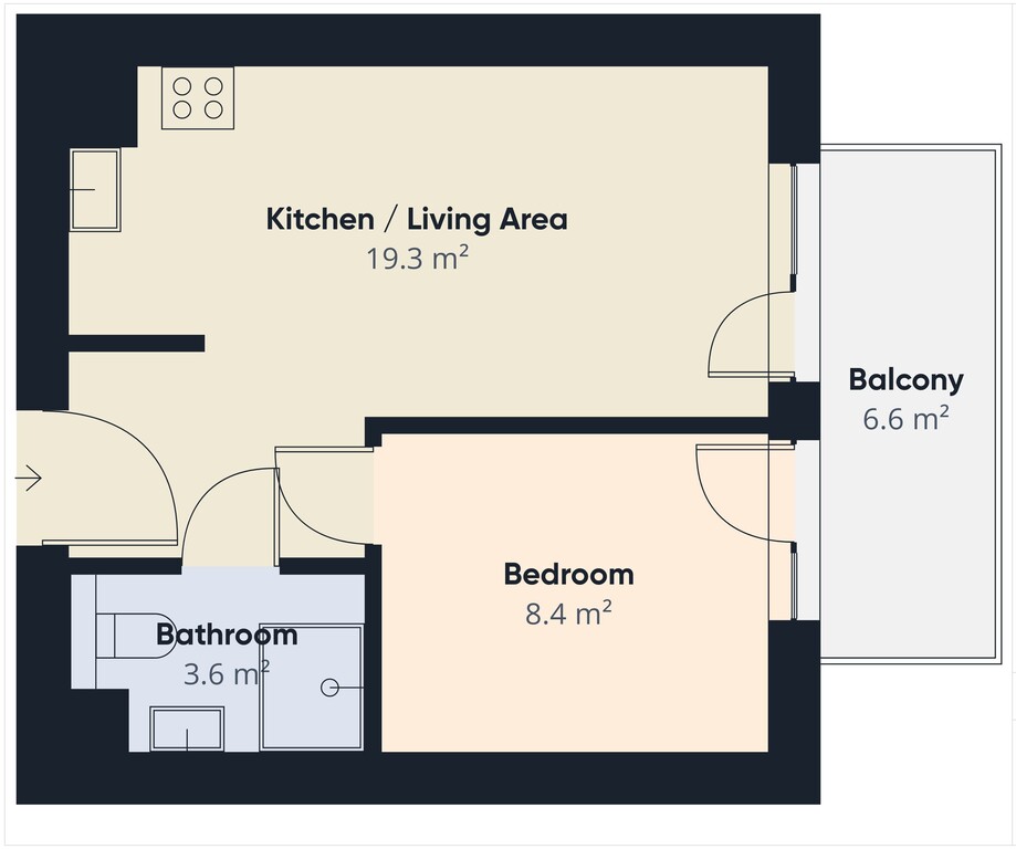 - salon z aneksem kuchennym (ok 17 m²) oraz wyjściem na duży balkon (ok 6,6 m²)