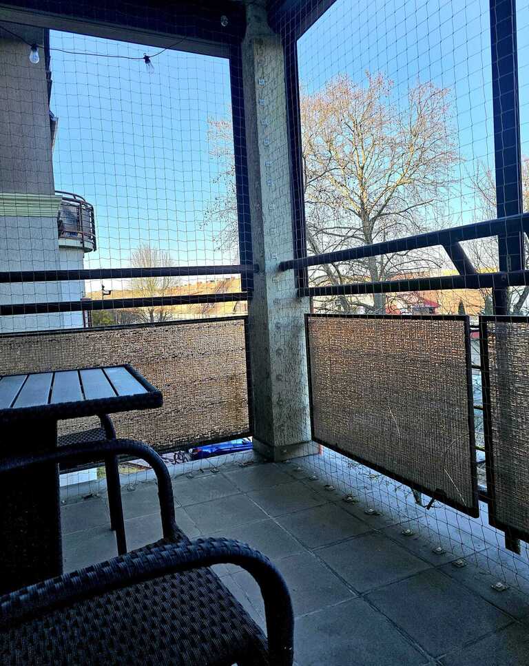 Atutem - sporych rozmiarów balkon, zaaranżowany, dodatkowo osiatkowany z zainstalowanymi roletami antywłamaniowymi.