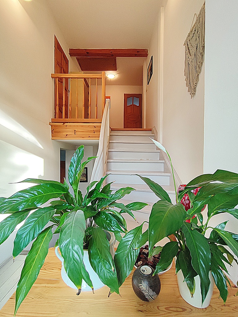 Na górę do części prywatnej gdzie znajdują się 4 sypialnie i pokój kąpielowy  poprowadzą nas schody i nietuzinkowy korytarz.