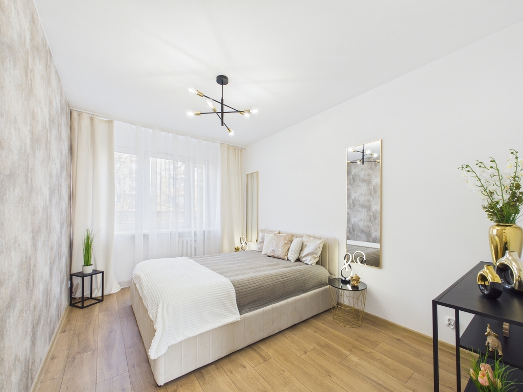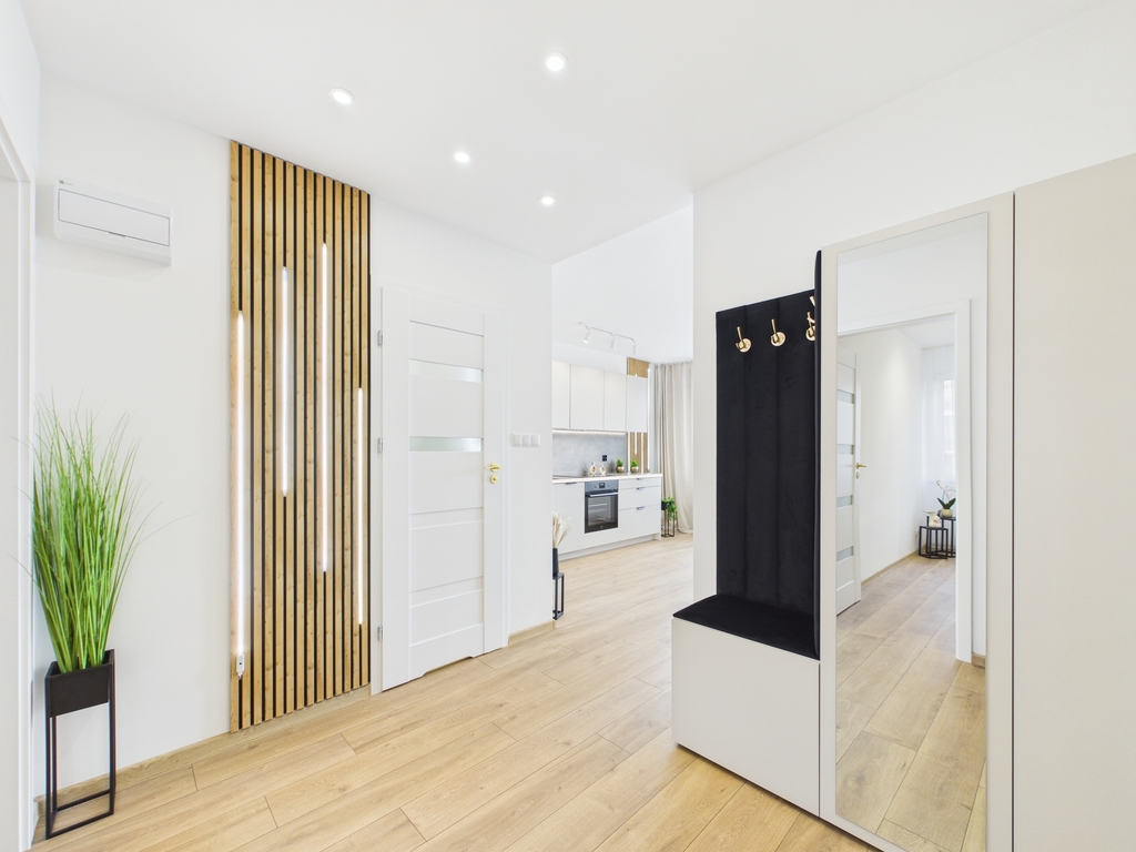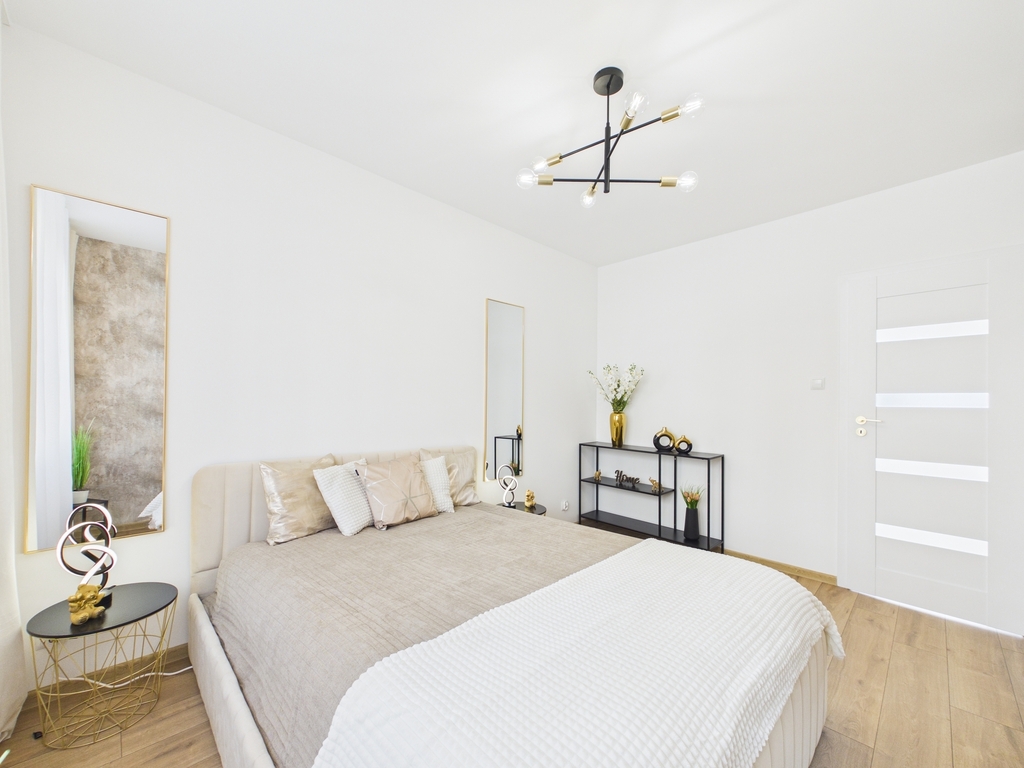 Nieruchomość została urządzona z dbałością o szczegóły i funkcjonalność, jak również zadbano o długotrwały komfort użytkowania. Zastosowano materiały wysokiej klasy, kaszmirowe ryflowane fronty zamawiane z Francji oraz wszystkie sprzęty AGD marki Electrolux. Na podłogach zostały zamontowane wodoodporne panele klasy AC5, z 24 godzinną wytrzymałością na wodę.