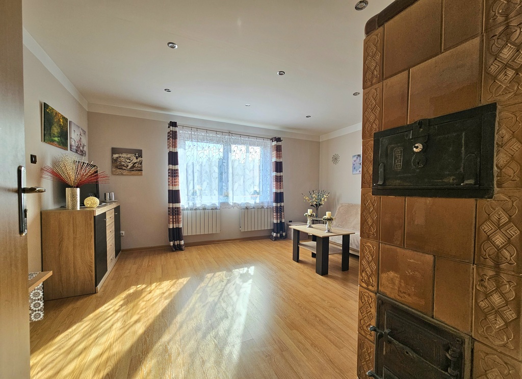 pokój z piecem kaflowym – ok. 21 m², panele, ściany malowane