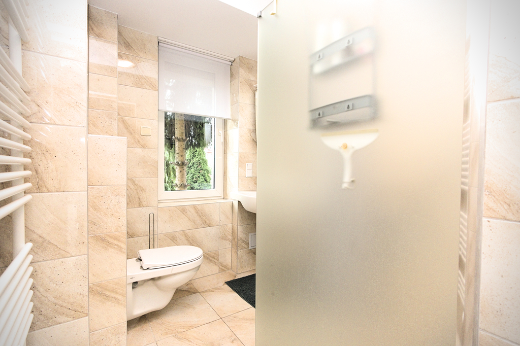 - łazienka z WC oraz prysznicem typu walk in- bez kabiny, z odpływem w podłodze.
