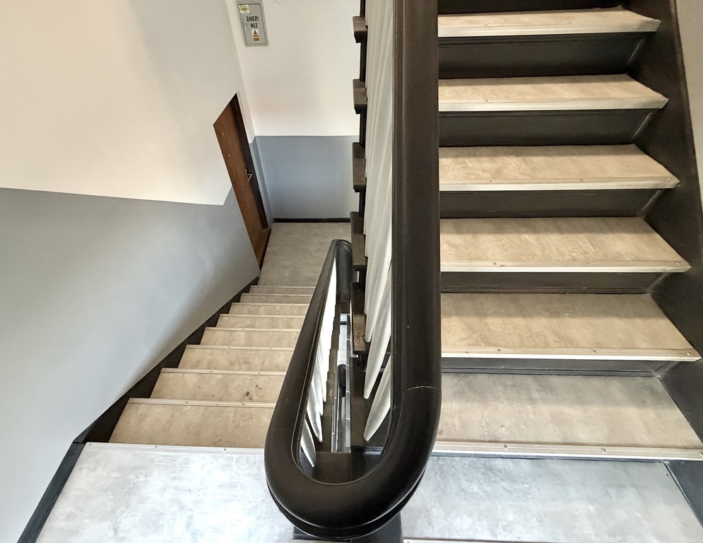 Mieszkanie znajduje się na 3 piętrze niskiego budynku, powstało w wyniku adaptacji poddasza.