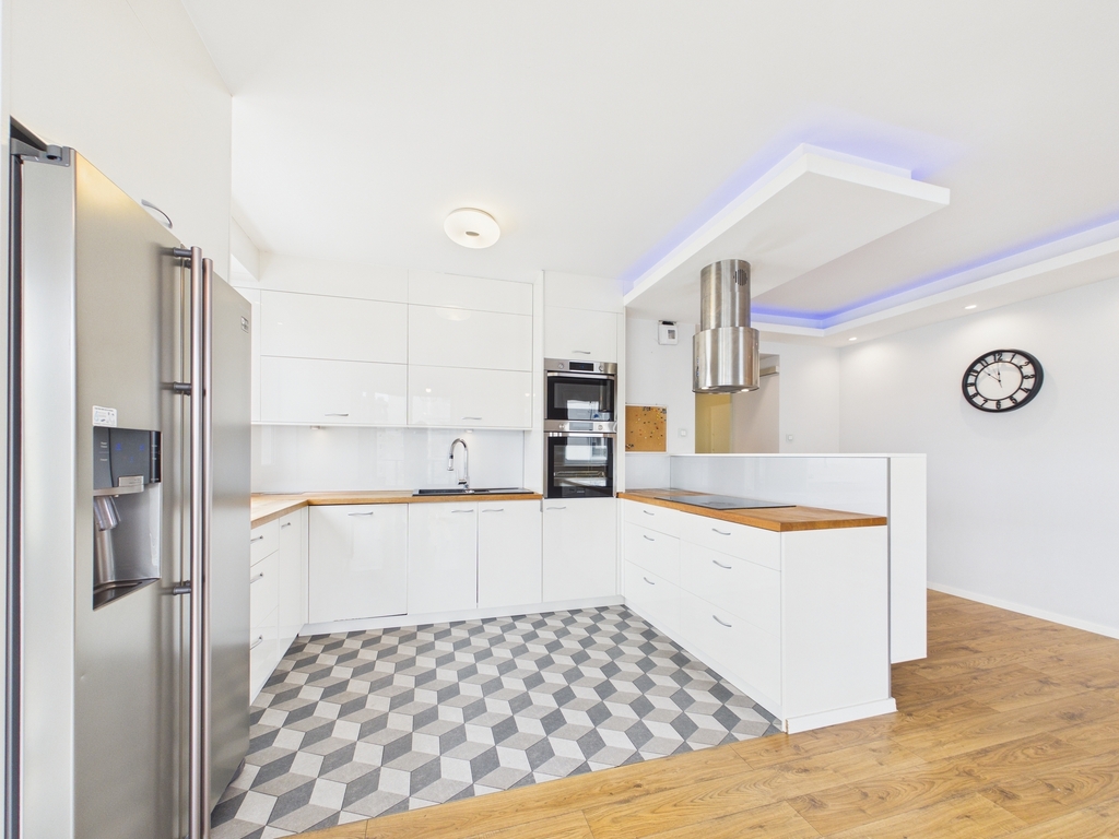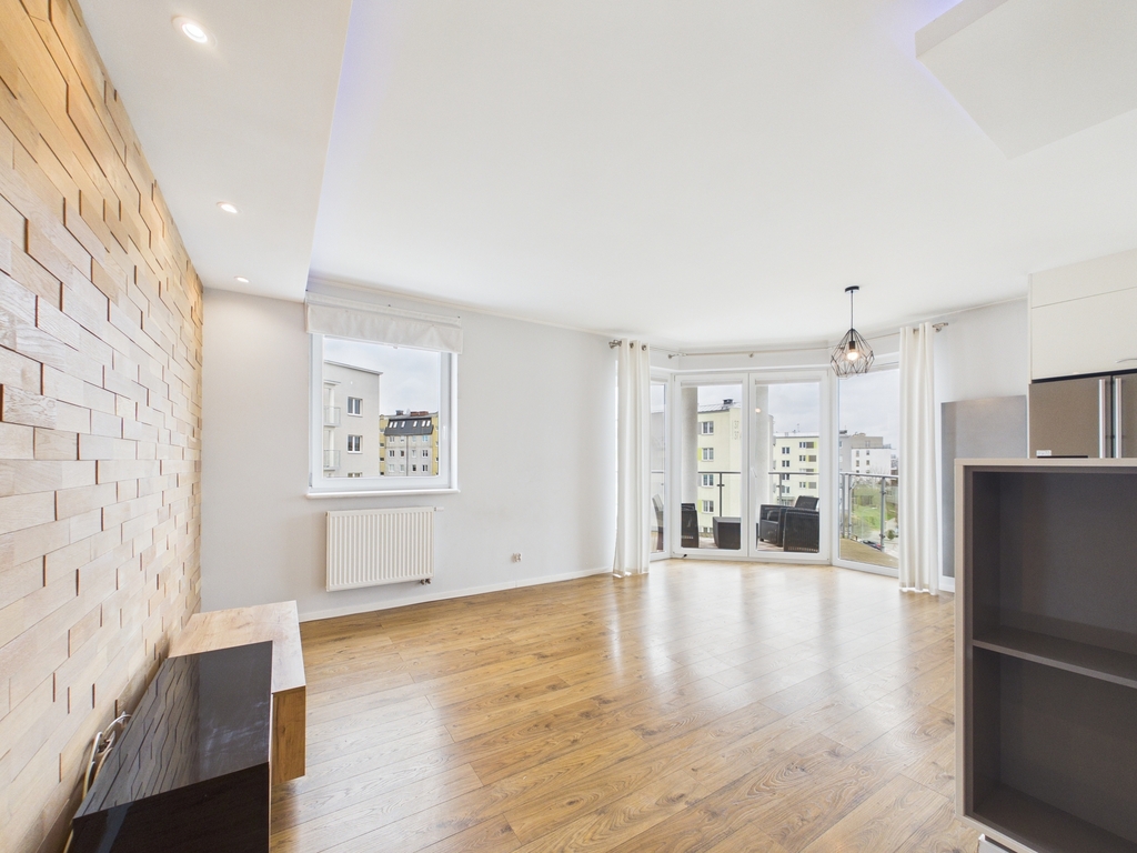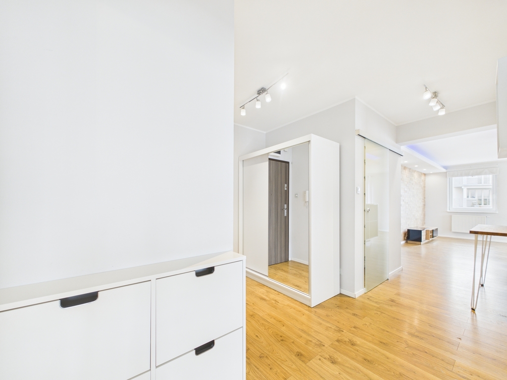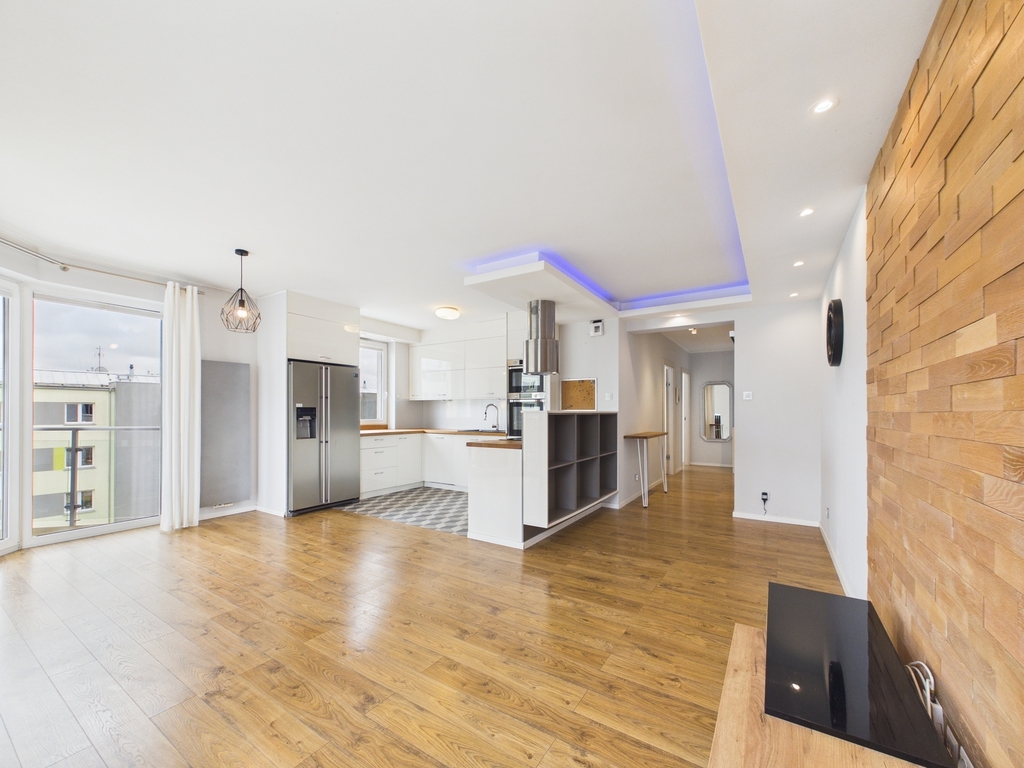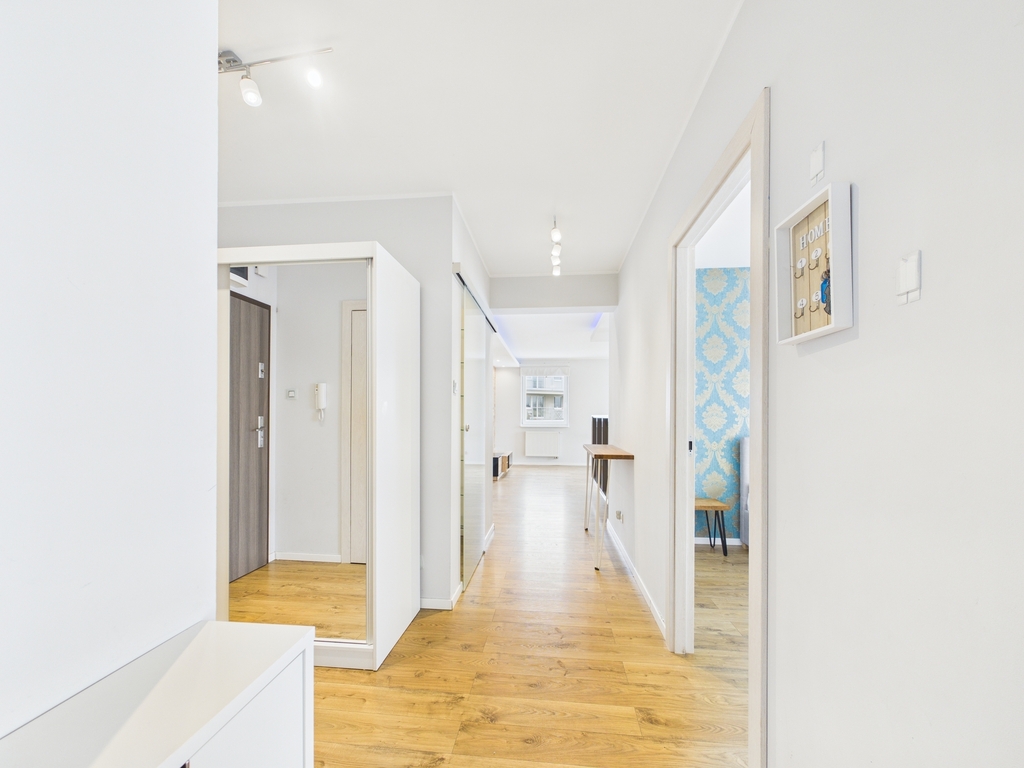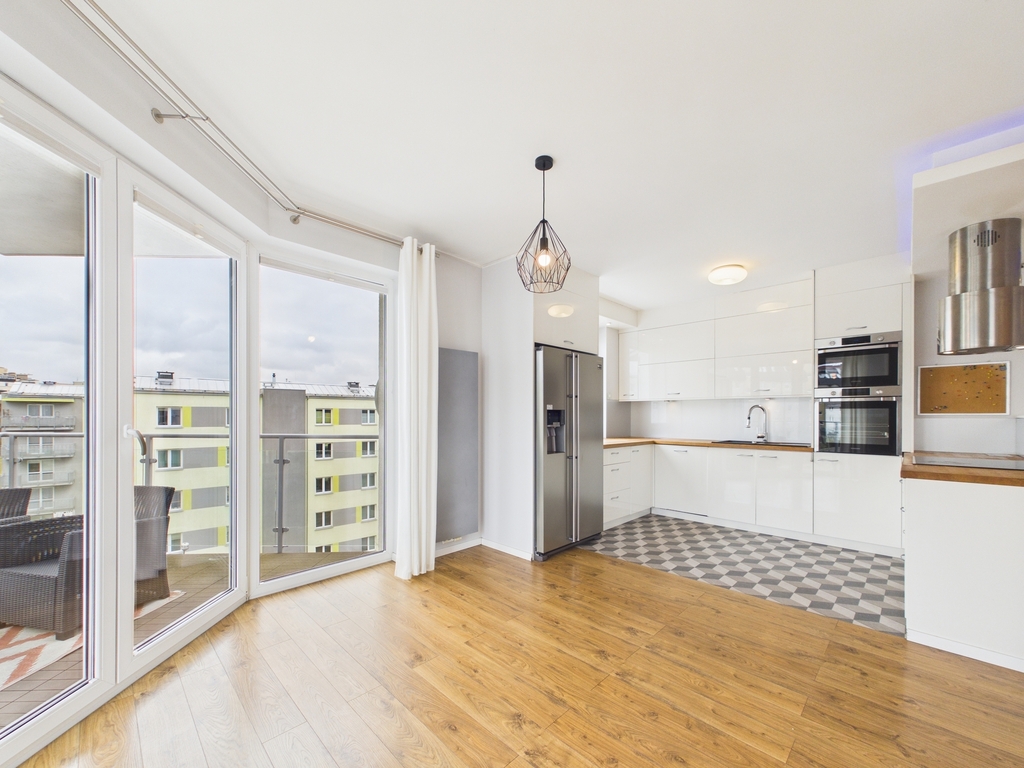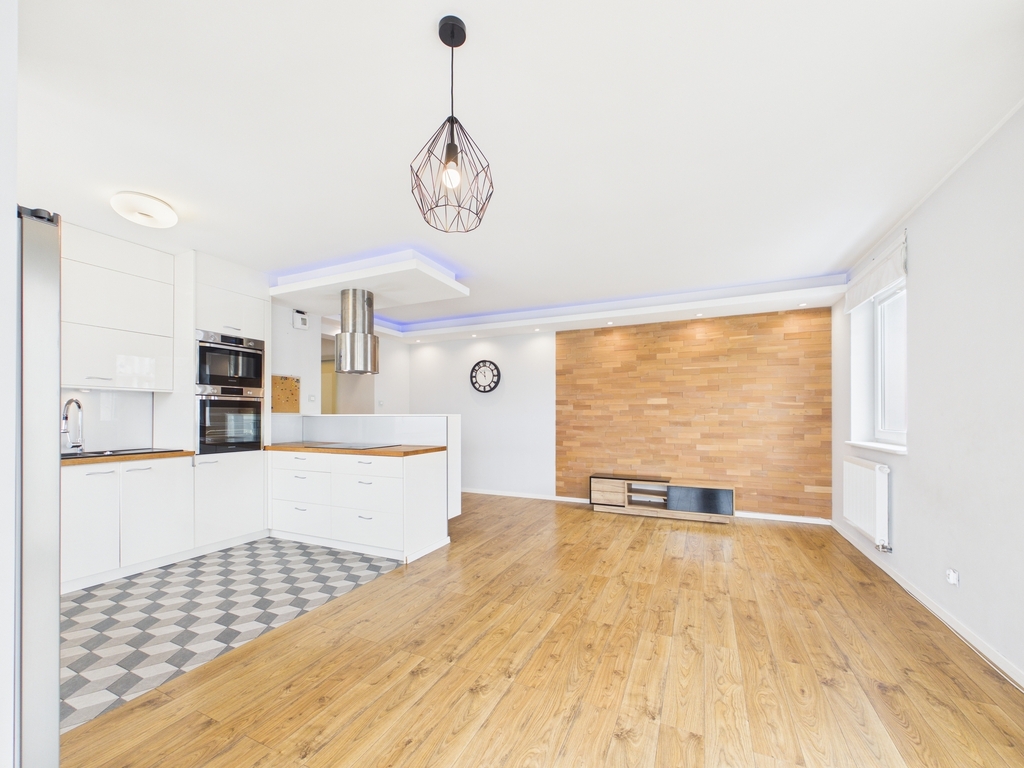Mieszkanie zostało wykończone z materiałów wysokiej jakości, a w kuchni znajdują się funkcjonalne meble w zabudowie.