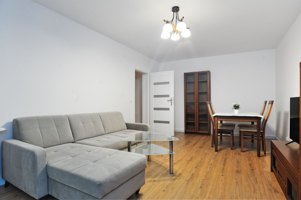 OPIS MIESZKANIA: Mieszkanie charakteryzuje się bardzo funkcjonalnym rozkładem. Salon wyposażony jest w wygodną kanapę, nowoczesną meblościankę z telewizorem oraz stół z krzesłami. Z danego pomieszczenia jest również, wyjście na balkon. Sypialnia posiada duże, wygodne łóżko, pojemną szafę, komodę i burko do pracy. Kuchnia oddzielna, wyposażona w niezbędny sprzęt AGD oraz umeblowana. Łazienka nowoczesna, w jasnej glazurze z kabiną prysznicową, umywalką z szafką i pralką. Obok znajduje się WC. W przedpokoju znajdują się pojemne szafy, które pomogą utrzymać porządek.