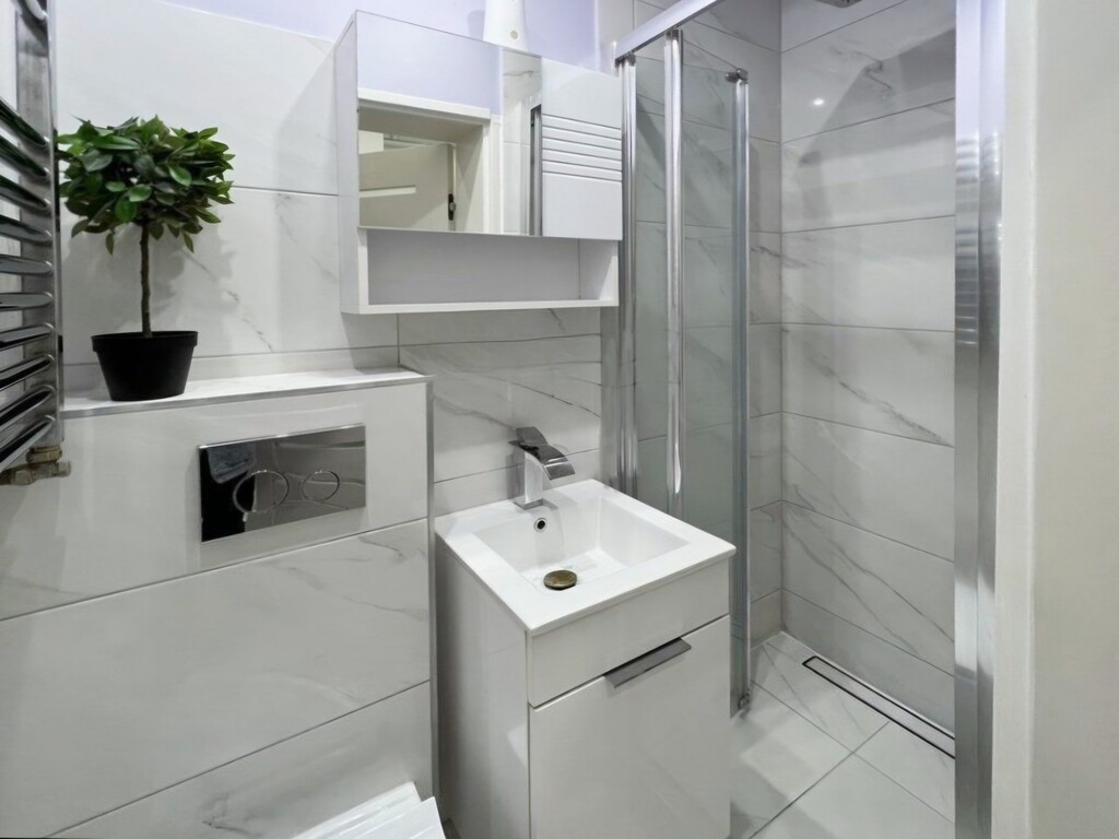 - jasna łazienka z prysznicem, umywalką, WC i pralką