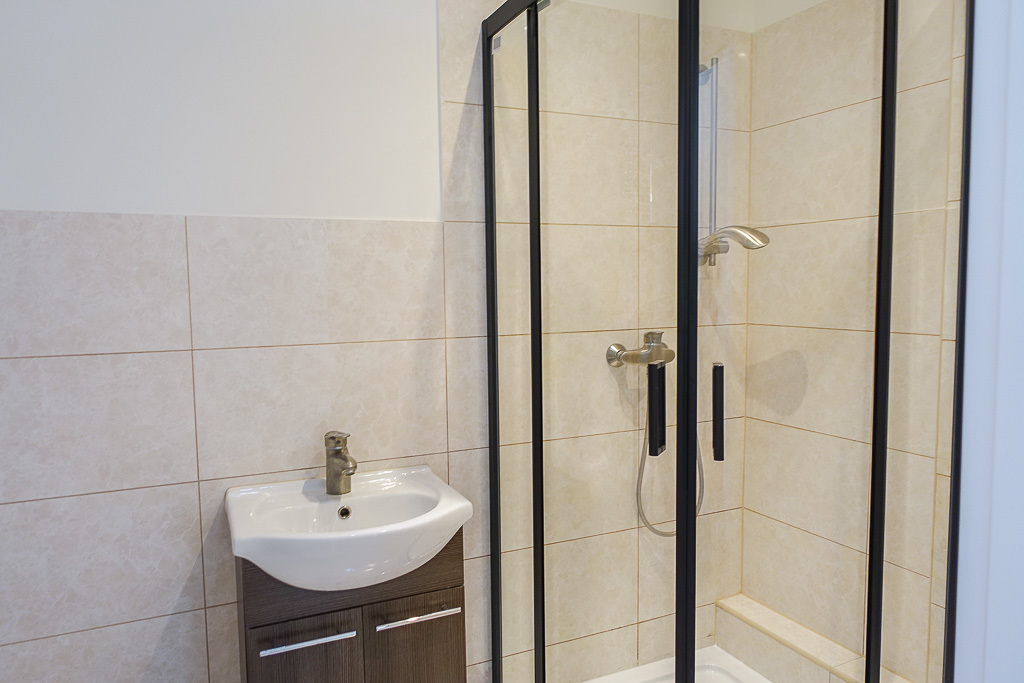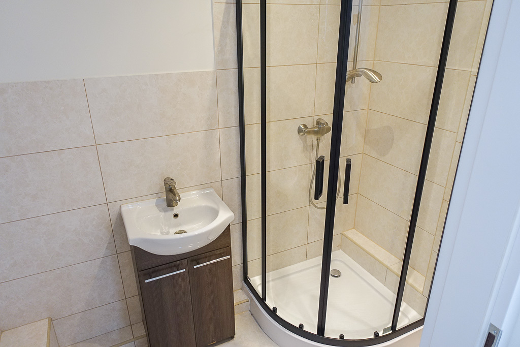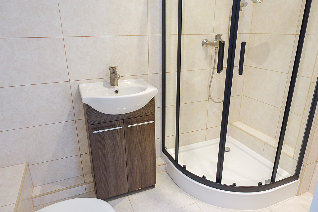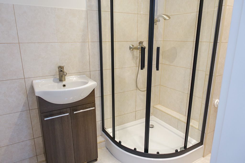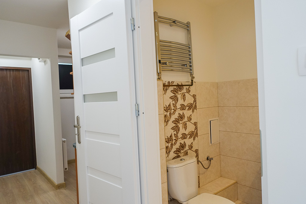 * W łazience glazura i terakota, nowa kabina prysznicowa z armaturą. Nowe piony.