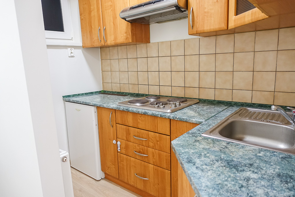 * Kuchnia oddzielna o powierzchni 4 m2, z oknem, w zabudowie w niej kuchenka elektryczna, mała lodówka, zlewozmywak nierdzewny, na ścianie glazura.