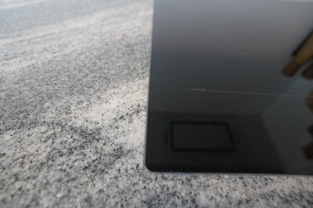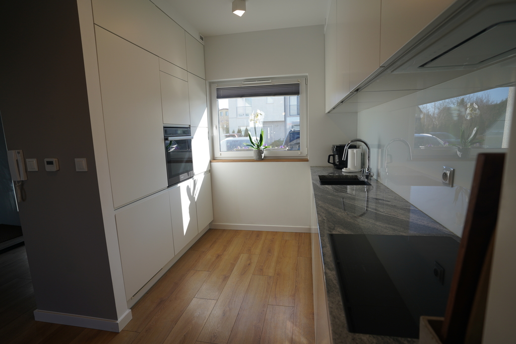 • Kuchnia stolarska na wymiar — blat z granitu Viscount White, fronty lakierowane mat, lodówka 70 cm w zabudowie, piekarnik i zmywarka w zabudowie, płyta indukcyjna zlicowana z blatem, zlew i bateria Grohe