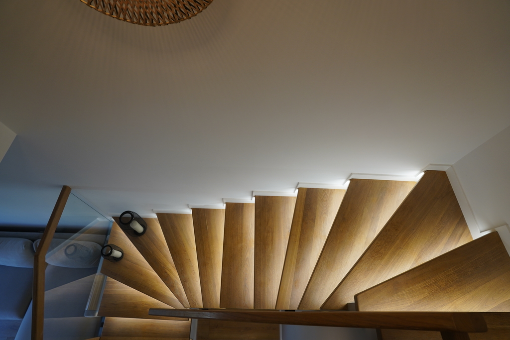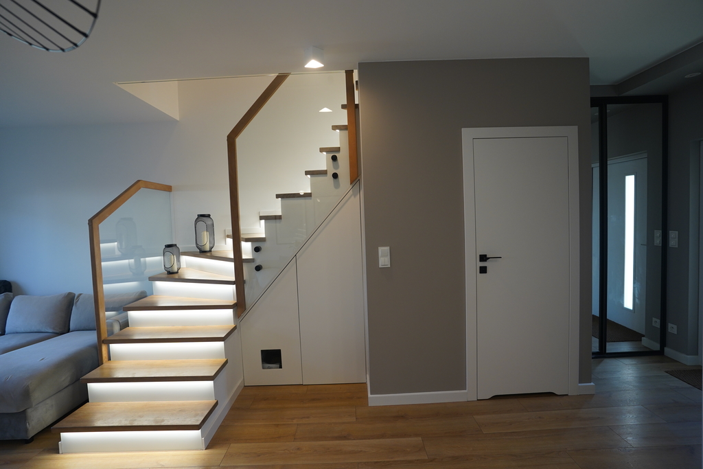 • Schody z litego dębu z szklanymi balustradami i podświetleniem LED